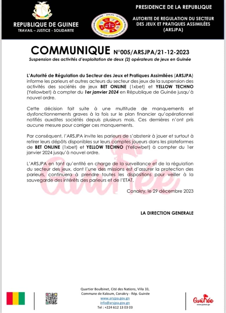 Dans un communiqué rendu public ce 29 décembre 2023, l’Autorité de Régulation du Secteur des Jeux et Pratiques Assimilées (ARSJPA) a informé les parieurs et autres acteurs du secteur des jeux de la suspension des activités des sociétés de jeux BET ONLINE (1xbet) et YELLOW TECHNO (Yellowbet) à compter du 1er janvier 2024 en République de Guinée jusqu’à nouvel ordre.