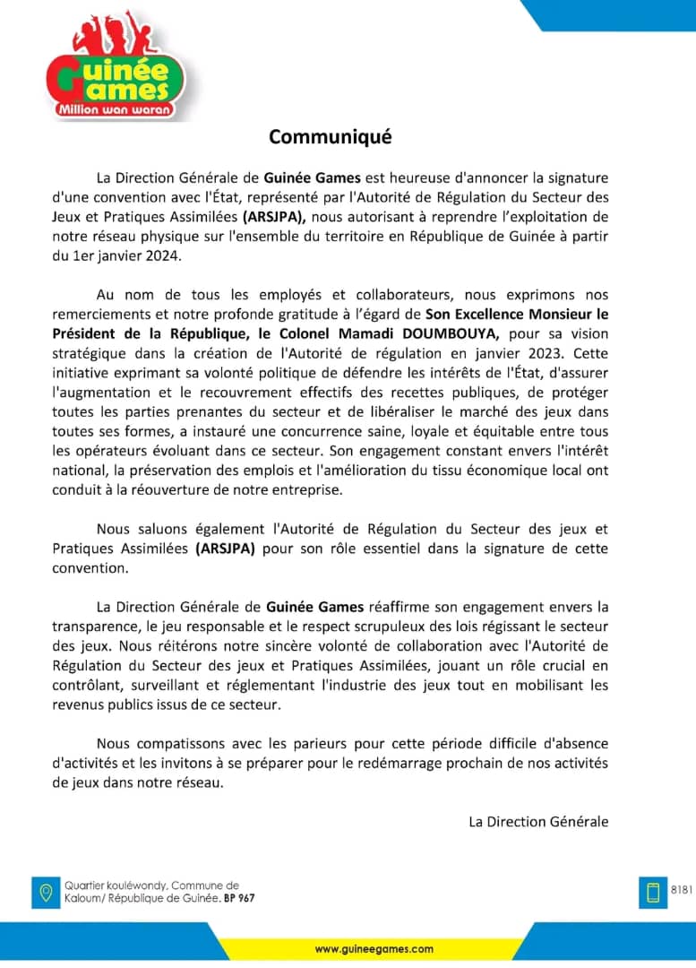 Au même moment, la Direction Générale de Guinée Games à travers un communiqué rendu public a annoncé la signature d’une convention avec l’État, représenté par l’Autorité de Régulation du Secteur des Jeux et Pratiques Assimilées (ARSJPA), autorisant la société à reprendre l’exploitation de son réseau physique sur l’ensemble du territoire en République de Guinée à partir du 1er janvier 2024.