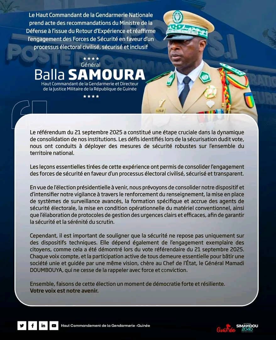Sauf changement de dernière minute, le peuple de Guinée se rendra aux urnes dans le cadre de l’élection présidentielle du 28 décembre 2025. A laurée de ce scrutin qualifié de majeur par certains observateurs, le haut commandant de la Gendarmerie nationale lève déjà un coin du voile sur le dispositif sécuritaire en vue. Le Général Balla Samoura annonce qu’ils prévoient de consolider leur dispositif et d’intensifier la vigilance à travers le renforcement du renseignement. Le directeur de la justice militaire annonce également la mise en place des systèmes de surveillance avancés, la formation spécifique et accrue des agents de sécurité électorale ou encore la mise en condition opérationnelle du matériel conventionnel. Plus loin, le patron de la Gendarmerie guinéenne souligne que la sécurité ne repose pas uniquement sur des dispositifs techniques, mais sur « l’engagement exemplaire » des citoyens.