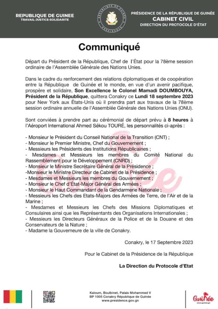Si l’information était officieuse depuis plusieurs jours maintenant, elle est dorénavant officielle. En effet, dans le cadre de la 78ème session ordinaire de l’Assemblée générale des Nations-Unies qui s’ouvre le 19 septembre courant, le chef de la junte guinéenne s’envole ce lundi, 18 septembre 2023, pour rallier le siège de l’ONU, à New York. Nous avons appris cette information à travers un communiqué du cabinet de la Présidence guinéenne, parvenu au desk de Siaminfosm.com dans l’après-midi de ce dimanche, 17 septembre 2023. Il s’agira de la première sortie du tombeur d’Alpha Condé sur le continent américain, depuis le coup d’État du 5 septembre 2021. Ci-dessous, ledit communiqué !