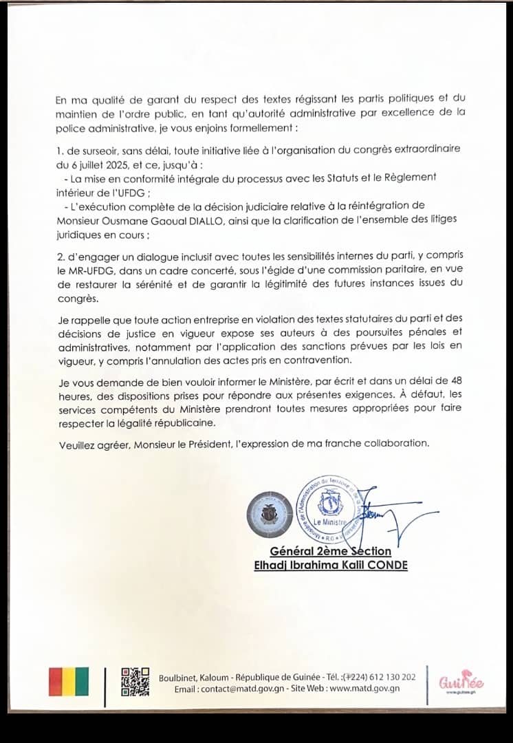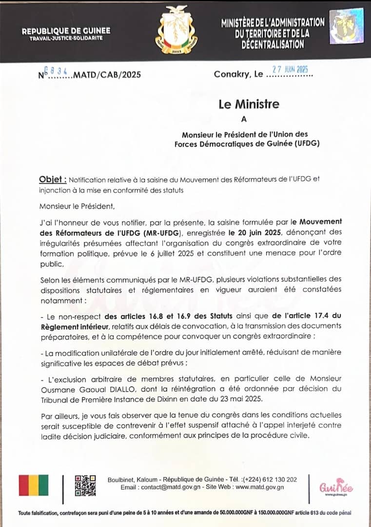Dans cette note, le MATD ordonne à l’UFDG d’exécuter la décision relative à la réintégration d’Ousmane Gaoual Diallo, exclu du parti depuis son mariage avec le pouvoir actuel.