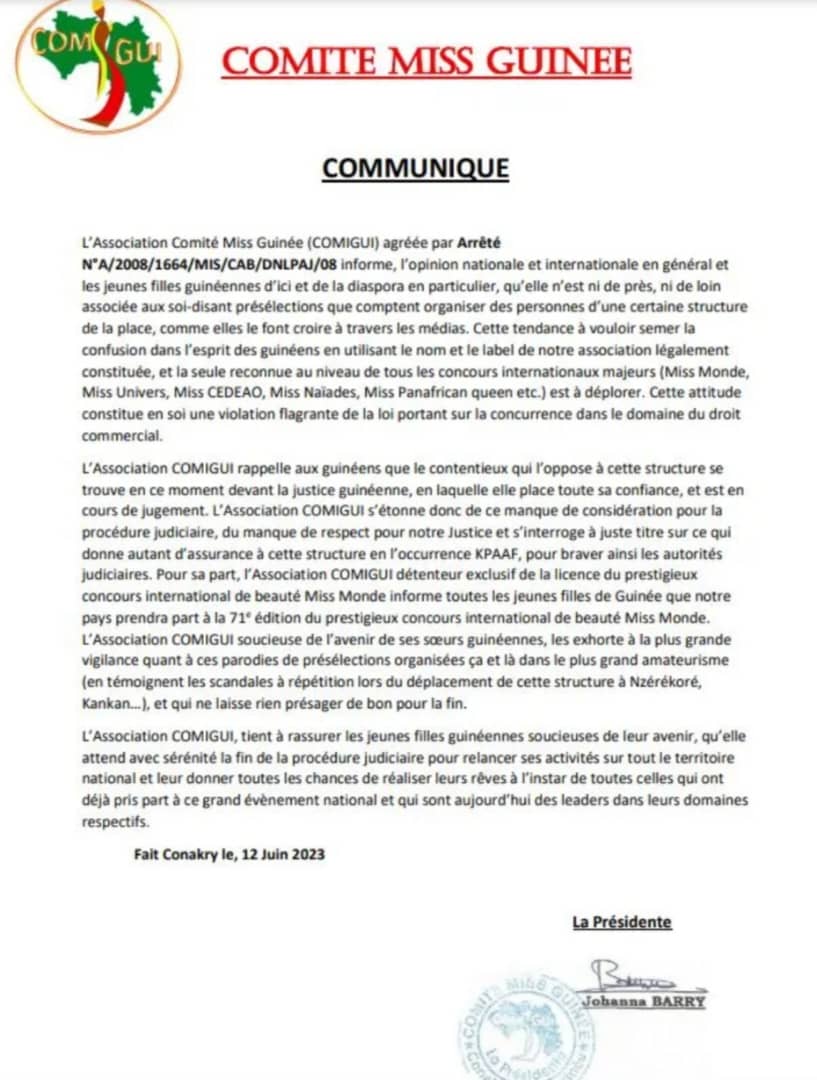 A travers un communiqué en date du 12 juin 2023, la structure Comité Miss Guinée (COMIGUI) dirigée par Johanna Barry a informé l’opinion nationale et internationale en général et les jeunes filles guinéennes d’ici et de la diaspora en particulier, qu’elle n’est ni de près, ni de loin associée aux soi-disant présélections que comptent organiser des personnes d’une certaine structure de la place, comme elles le font croire à travers les médias.