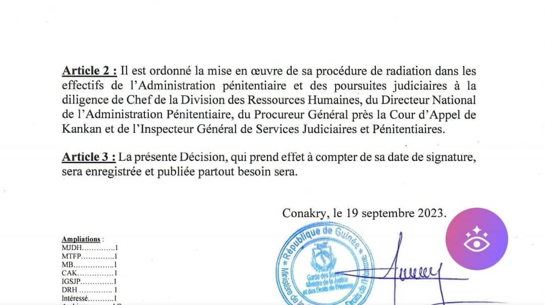 Dans cette même décision, Alphonse Charles Wright a ordonné la mise en œuvre de sa procédure de radiation dans les effectifs de l’Administration pénitentiaire et des poursuites judiciaires à la diligence de Chef de la Division des Ressources Humaines, du Directeur National de l’Administration Pénitentiaire, du Procureur Général près la Cour d’Appel de Kankan et de l’Inspecteur Général de Services Judiciaires et Pénitentiaires.