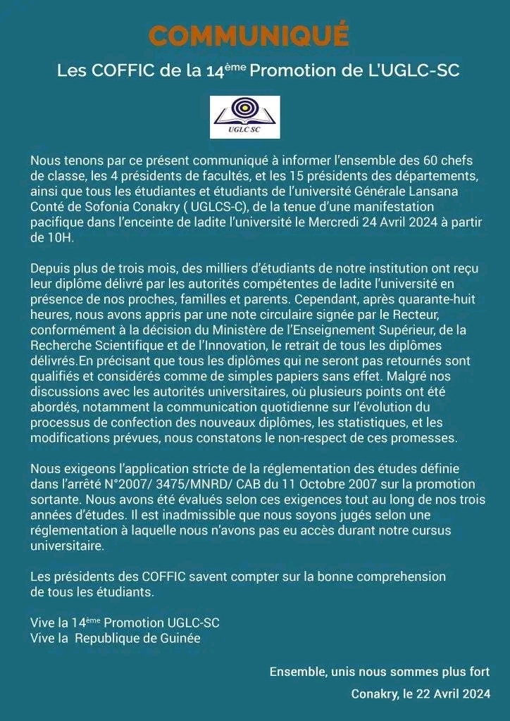 Le bras de fer qui oppose les étudiants sortants de la 14ème promotion de l’Université Général Lansana Conté de Sonfonia aux dirigeants de cette institution d’enseignement supérieur est loin de connaître son épilogue. A travers la Commission d’organisation des festivités de fin de cycle, ces étudiants ont informé l’ensemble des 60 chefs de classe, les 4 présidents de facultés, et les 15 présidents des départements, ainsi que tous les étudiantes et étudiants de l’université, de la tenue d’une nouvelle manifestation pacifique dans l’enceinte de ladite institution ce mercredi, 24 Avril 2024.