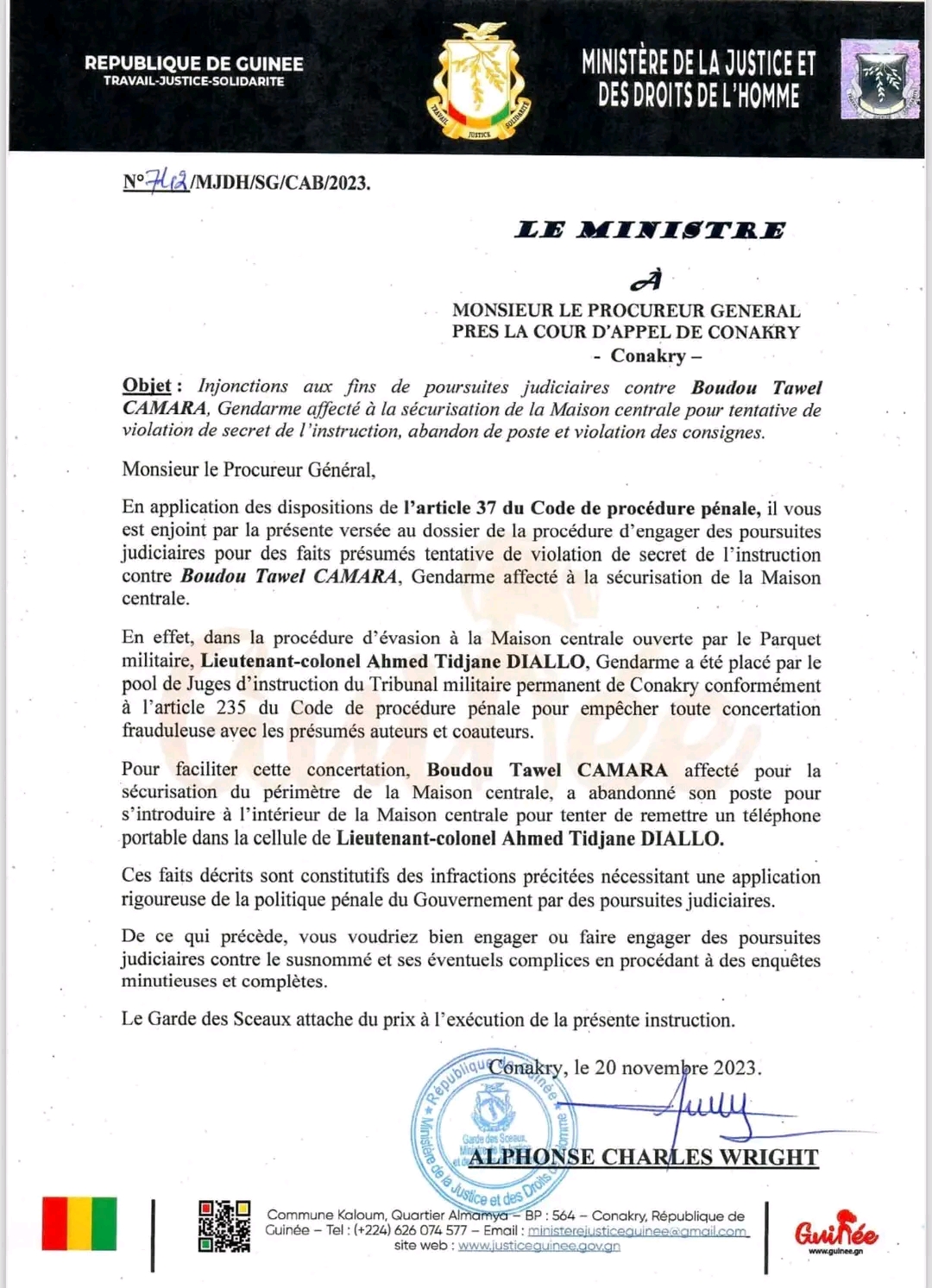Deux semaines après l’évasion à la maison centrale de Conakry, les têtes continuent de tomber. Le ministre de la Justice et des droits a ordonné ce lundi d’engager des poursuites judiciaires contre Boudou Tawel CAMARA, Gendarme affecté à la sécurisation de la Maison centrale pour tentative de violation de secret de l’instruction, abandon de poste et violation des consignes.