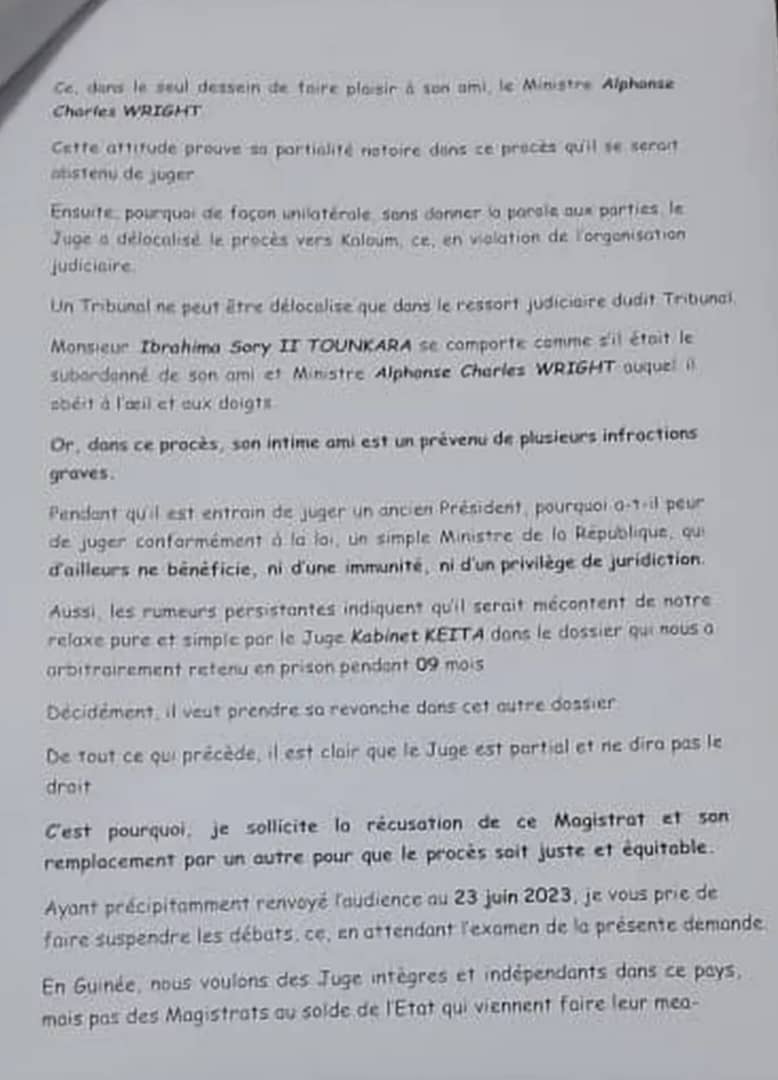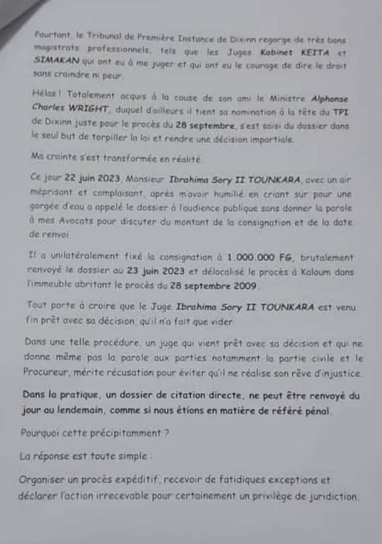 En portant plainte contre Alphonse Charles WRIGHT devant le Tribunal de Première Instance de Dixinn, dit Fonikè Menguè, « j’étais animé d’un sentiment de crainte que Monsieur Ibrahima Sory II TOUNKARA, son ami de longue date se saisisse de ce dossier pour jugement dès lors qu’il est de notoriété publique que ce magistrat est un juge naturellement acquis à la cause du pouvoir ».