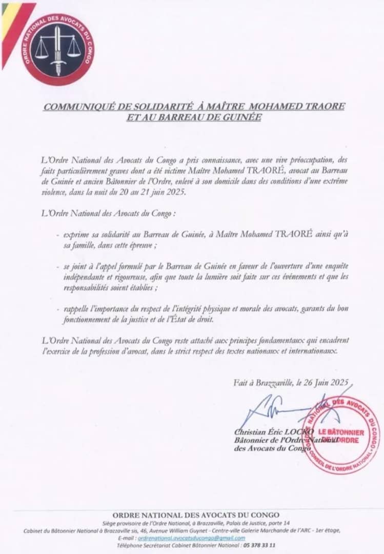 A travers un communiqué rendu public ce jeudi, 26 juin, 2025, l’ordre national des avocats du Congo appelle les autorités guinéennes à faire la lumière.
