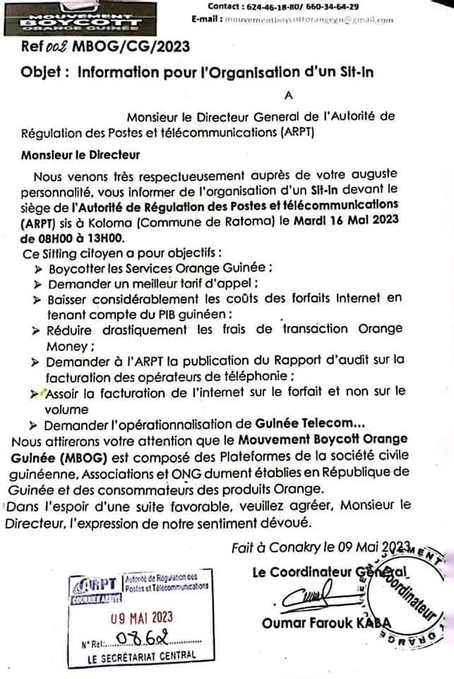 Selon une lettre d’information adressée au DG de l’ARPT par les membres du mouvement, ce Sit-in dit citoyen a pour objectifs de boycotter les Services Orange Guinée; demander un meilleur tarif d’appel; baisser considérablement les coûts des forfaits internet en tenant compte du PIB guinéen; réduire drastiquement les frais de transaction Orange Money; demander à l’ARPT la publication du Rapport d’audit sur la facturation des opérateurs de téléphonie; assoir la facturation de l’internet sur le forfait et non sur le volume; demander l’opérationnalisation de Guinée Telecom.