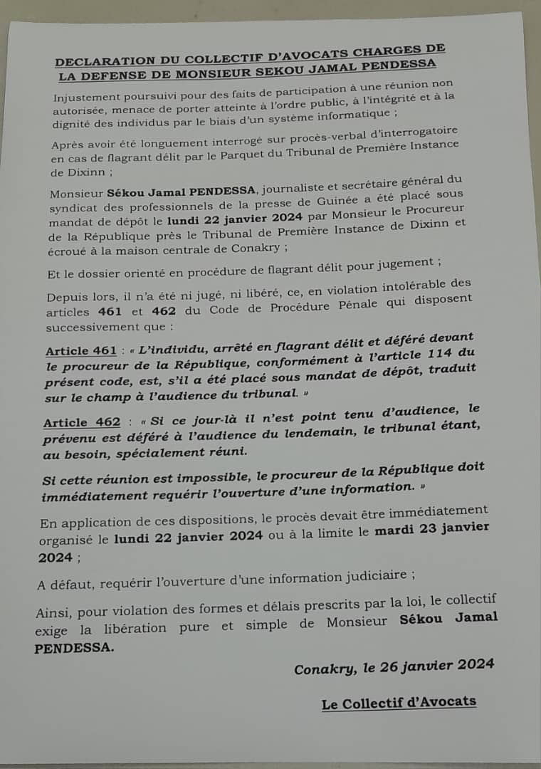 Arrêté il y a quelques jours, le secrétaire général du Syndicat des Professionnels de la Presse de Guinée (SPPG) reste incarcéré à la maison centrale de Conakry. Aux dires de ses avocats, Sékou Jamal Pendessa est détenu illégalement en prison. Dans une déclaration dont copie est parvenue au desk de Siaminfos.com dans la matinée de ce vendredi, 26 janvier 2024, le collectif d’avocats du secrétaire général du SPPG a dénoncé cet état de fait. Sans se voiler la face, ses conseils exigent sa libération pure et simple.