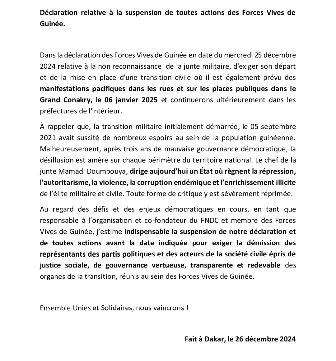 Dans une déclaration rendue publique mardi, 25 décembre 2024, les Forces Vives de Guinée (FVG) ont une nouvelle fois haussé le ton. Le collectif a ainsi appelé à une nouvelle manifestation de rue le 6 janvier prochain. Une décision qu’un acteur de la société civile guinéenne trouve inopportune.