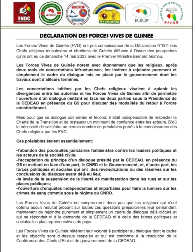 Appel au dialogue en Guinée : les Forces Vives répondent aux leaders religieux et maintiennent leurs manifestations