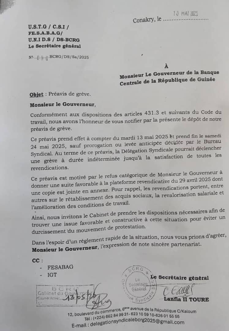 A travers un préavis de grève déposé auprès du gouverneur de la Banque Centrale dont nous détenons copie, ces travailleurs dénoncent « le refus catégorique du gouverneur de la Banque Centrale à donner une suite favorable à leur plate-forme revendicative dans laquelle ils réclament le rétablissement des acquis sociaux, la revalorisation des salaires et l’amélioration des conditions de travail.