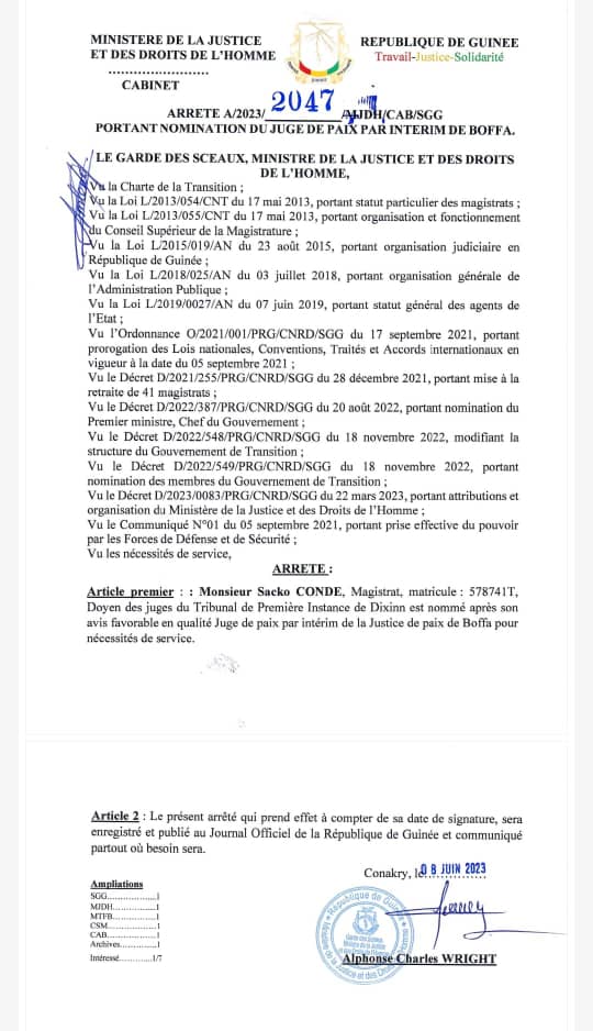 Le ministre de la Justice a pris un arrêté ce jeudi, 8 juin 2023, pour nommer un juge de paix par intérim à Boffa. Ce, quarante huit heures après la suspension du juge de paix de ladite juridiction. C’est le nommé Sacko Condé, magistrat, par ailleurs doyen des juges du tribunal de première instance de Dixinn, qui bénéficie de la confiance d’Alphonse Charles Wright. Ci-dessous, ledit arrêté.