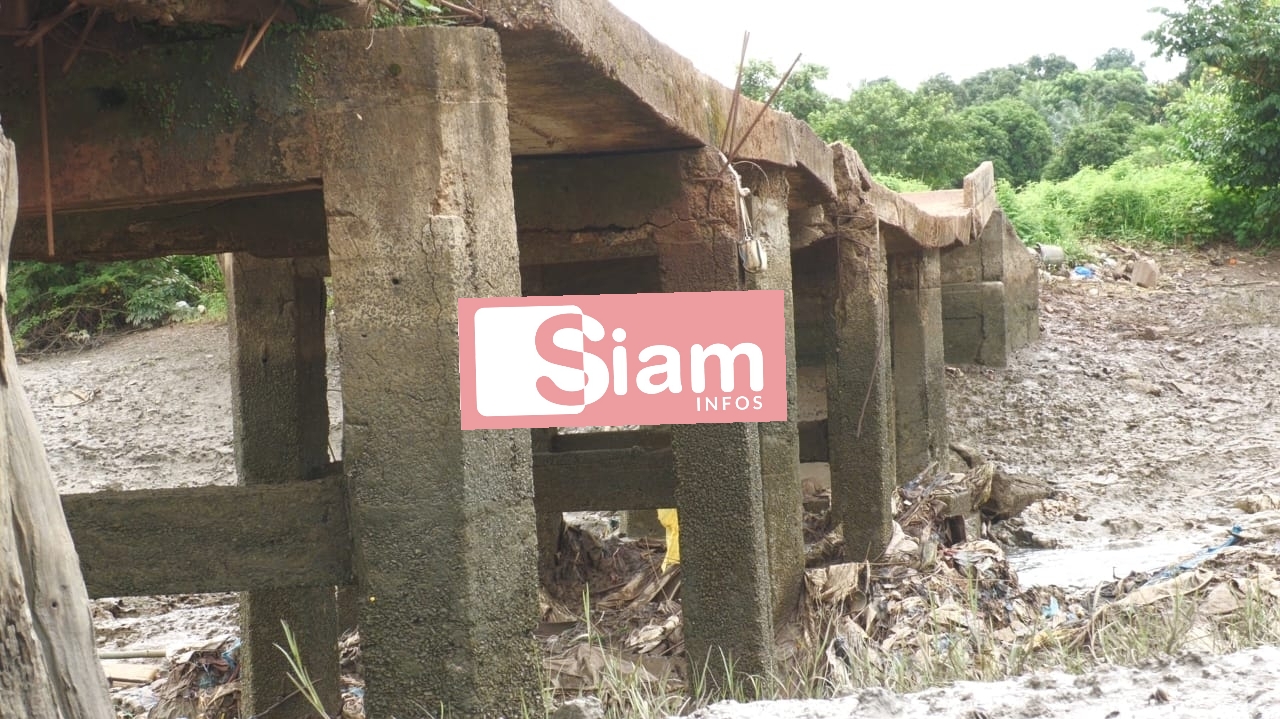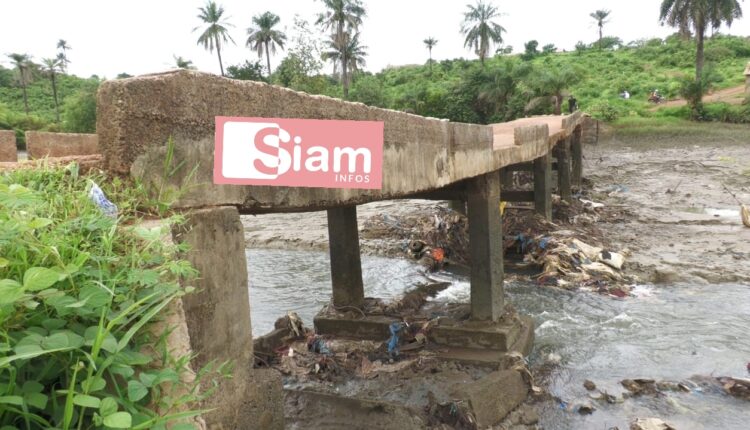 Ce pont de franchissement d’utilité publique facilite pourtant le mouvement des personnes et de leurs biens. Ce vieux pont fait en béton et en bois sans aucun respect des normes.