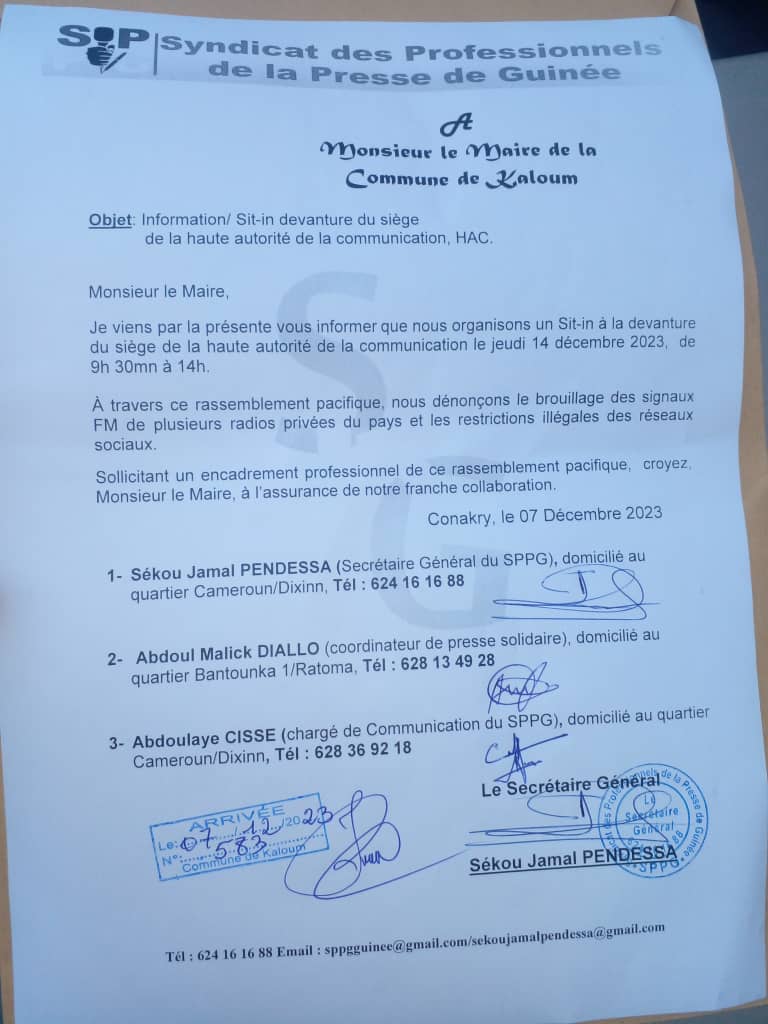 Suite au brouillage des ondes de plusieurs médias, le comité de coordination du plan de riposte du syndicat des professionnels de la presse de Guinée était à la Mairie de Kaloum ce jeudi, 07 décembre 2023, pour déposer le courrier d’information, annonçant la tenue d’un sit-in devant la Haute Autorité de la Communication le jeudi, 14 décembre prochain.