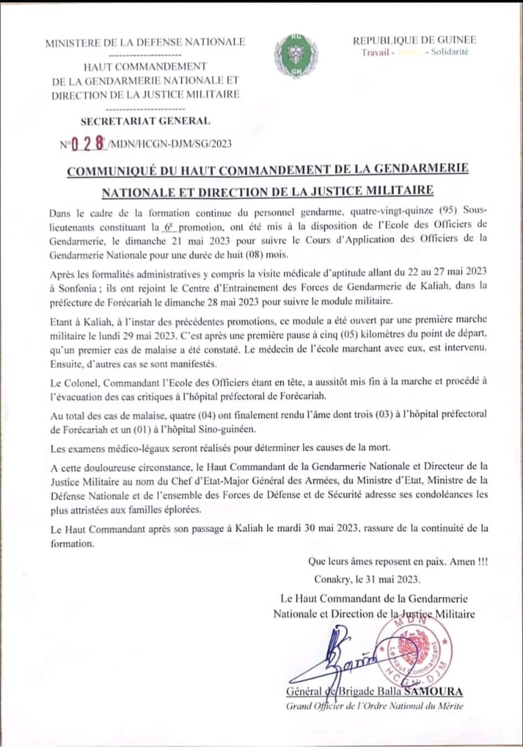 Pendant cette formation, quatre (04) sous-officiers ont finalement rendu l’âme dont trois (03) à l’hôpital préfectoral de Forecariah et un (01) à l’hôpital Sino-guinéen, nous apprend le Haut commandement de la gendarmerie nationale.