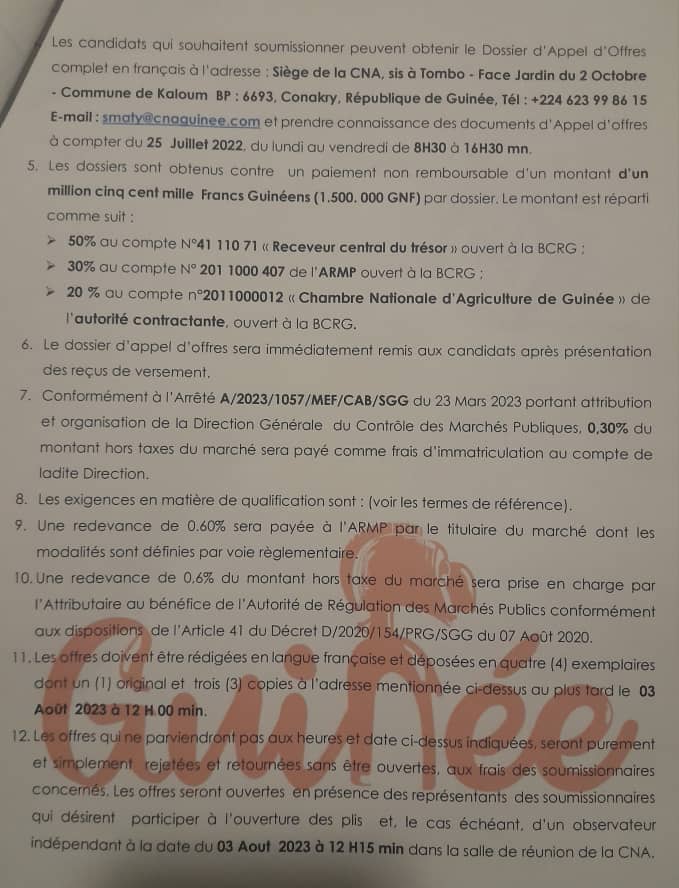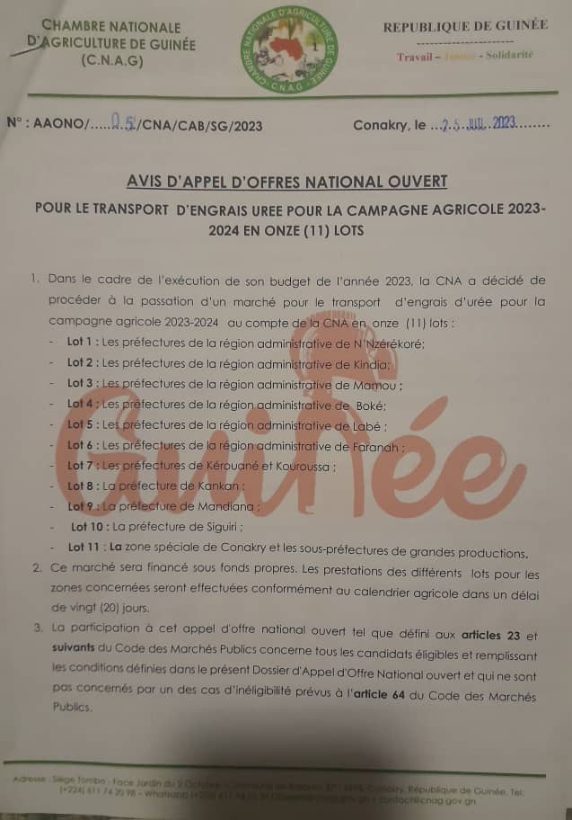 Dans le cadre de l’exécution de son budget de l’année 2023, la Chambre Nationale d’Agriculture de Guinée (CNAG) a décidé de procéder à la passation d’un marché pour le transport d’engrais d’urée pour la campagne agricole 2023-2024 dans onze (11) zones, à Conakry et à l’intérieur du pays.
