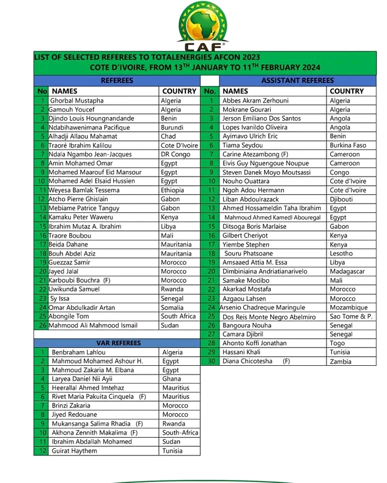 La Confédération Africaine de Football (CAF) a rendu publique la liste des 30 arbitres sélectionnés pour officier les maths de la Coupe d’Afrique des Nations 2023 en Côte d’Ivoire. Sur cette liste, aucun Guinéen n’y figure parmi les 30 arbitres sélectionnés.