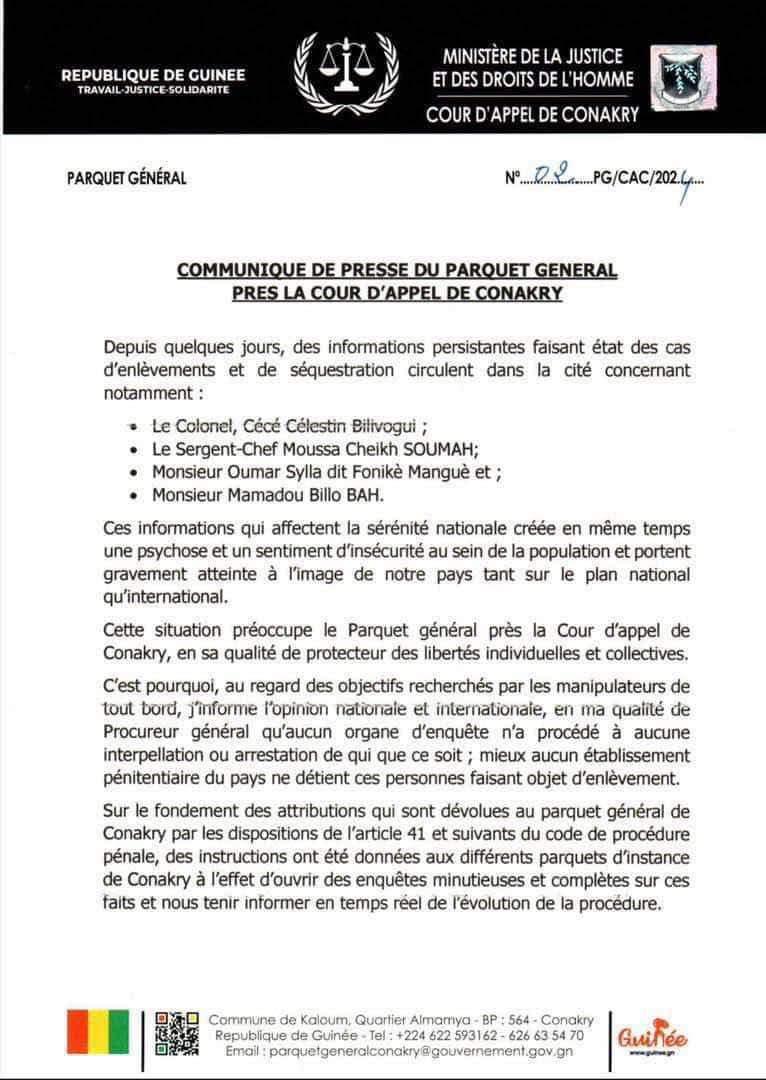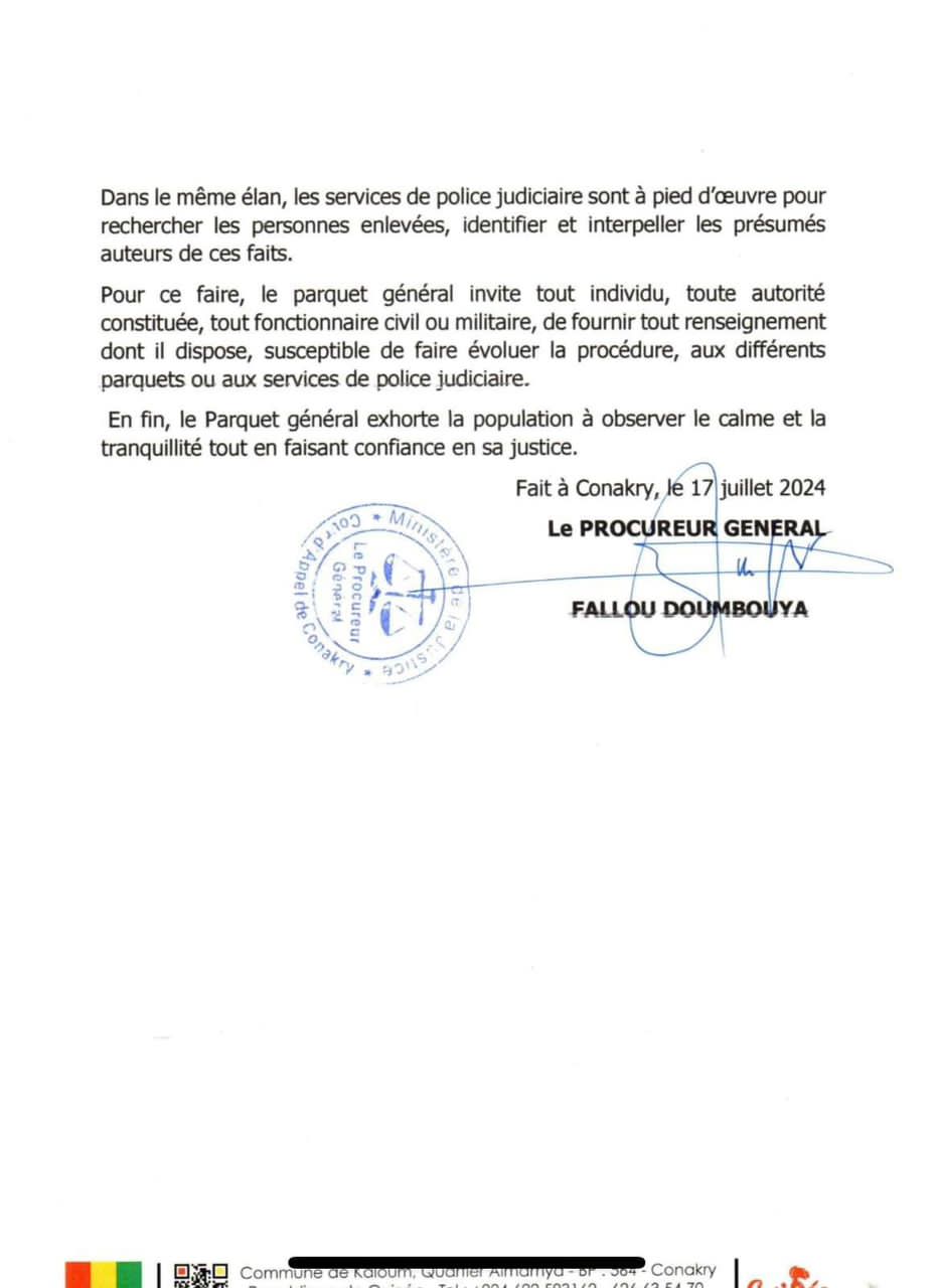Dans un communiqué de presse rendu public ce mercredi, 17 juillet 2024, Fallou Doumbouya a dit à qui veut l’entendre « qu’aucun organe d’enquête n’a procédé à aucune interpellation ou arrestation de qui que ce soit ; mieux aucun établissement pénitentiaire du pays ne détient ces personnes faisant état d’enlèvement ».