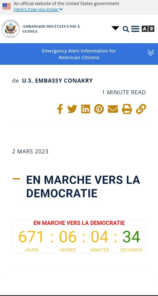 Sur le site officiel de la représentation diplomatique américaine en Guinée, l’on peut constater le lancement d’un compte à rebours de plus de 600 jours, rendu public ce vendredi, 31 mars 2023. En effet, cela s’inscrit dans le cadre du retour rapide à l’ordre constitutionnel, dans le pays. Pour Washington, il s’agit d’une « marche vers la démocratie ».