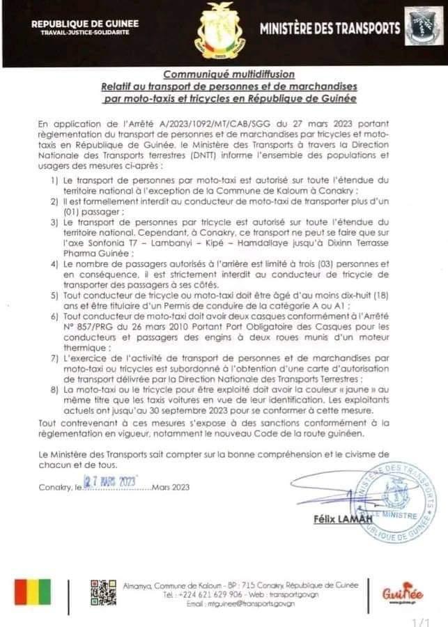 Dans un communiqué rendu public dans la nuit du lundi, 27 mars 2023, le Ministère des Transports a interdit aux conducteurs des motos tricycles dans le grand Conakry, de transporter les passagers à leurs côtés. Il leur est aussi demandé de ne circuler que sur l’axe Sonfonia T7-Lambangni-Kipé- Hamdallaye jusqu’à Dixinn, au niveau de la pharmacie centrale.
