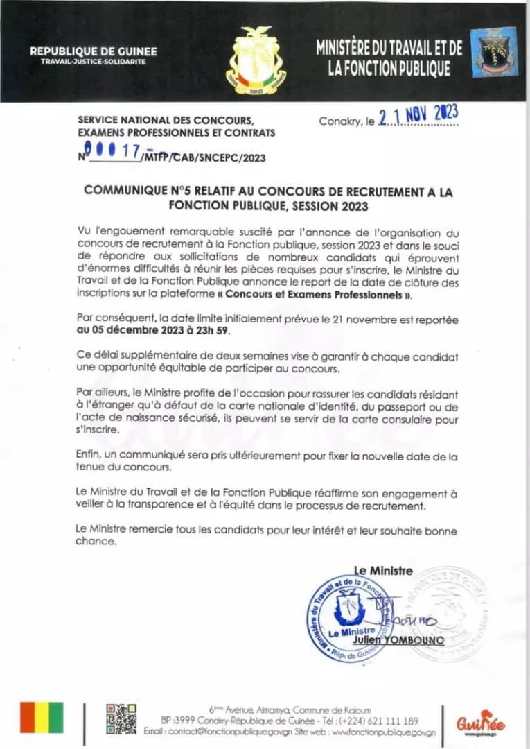 Concours pour la fonction publique : le ministre Julien Yombouno reporte la date de clôture des inscriptions
