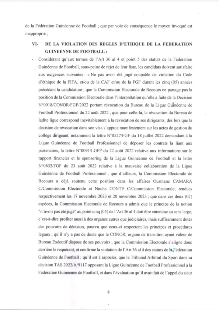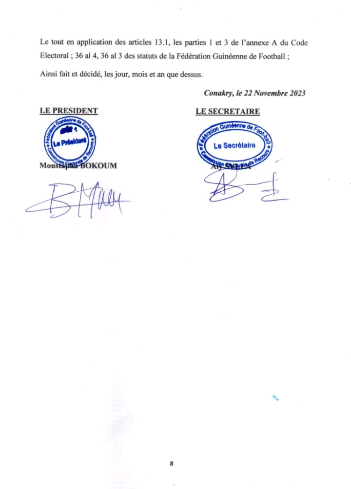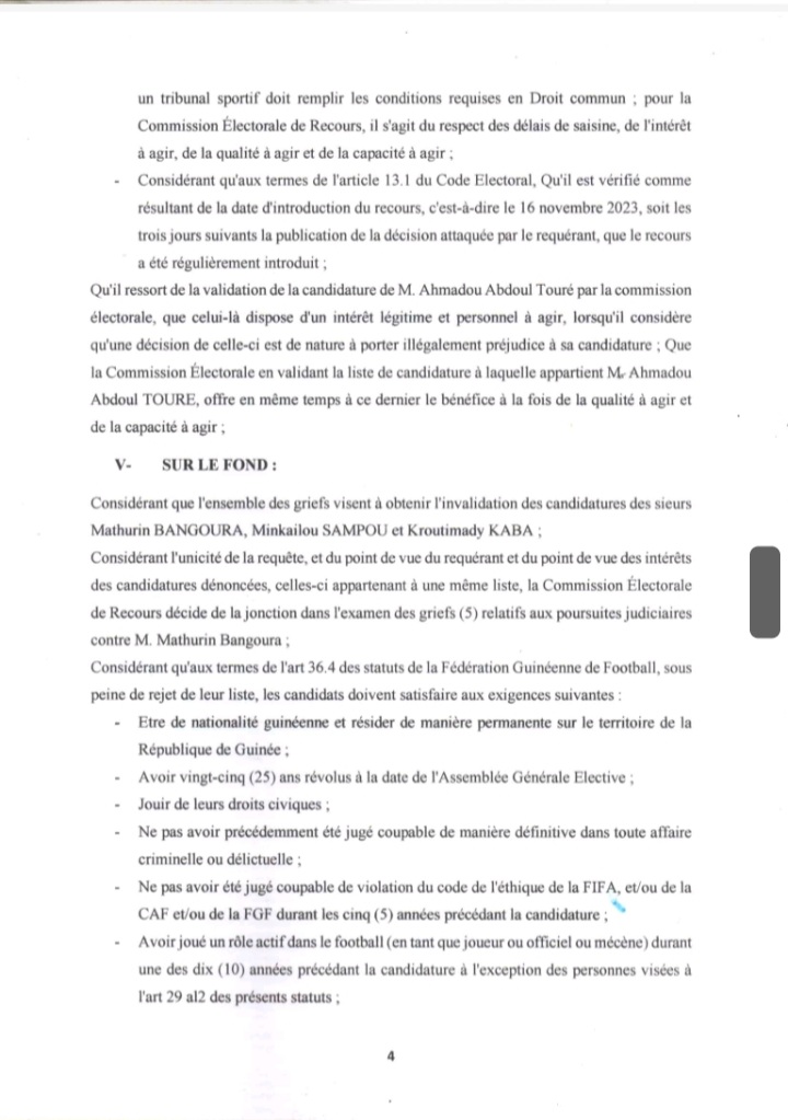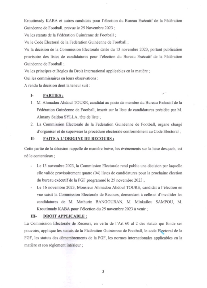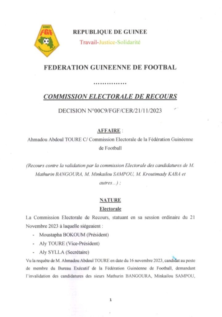 Après avoir validé le 13 novembre dernier les quatre listes de candidature pour la prochaine élection du bureau exécutif de la fédération guinéenne de football prévue pour ce samedi, 25 novembre 2023, la commission électorale de recours de la feguifoot vient d’invalider les candidatures de Mathurin Bangoura, Minkailou Sampou, Krouti Mady Baka et autres. Ce, après un recours de Mamadou Abdoul Touré, un autre candidat inscrit sur la liste présidée par Almamy Saïdou Sylla.