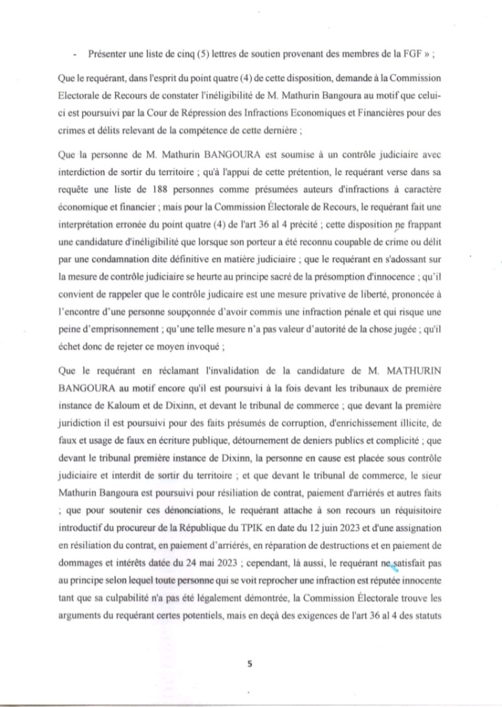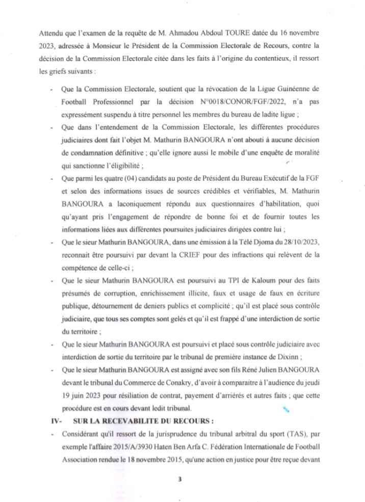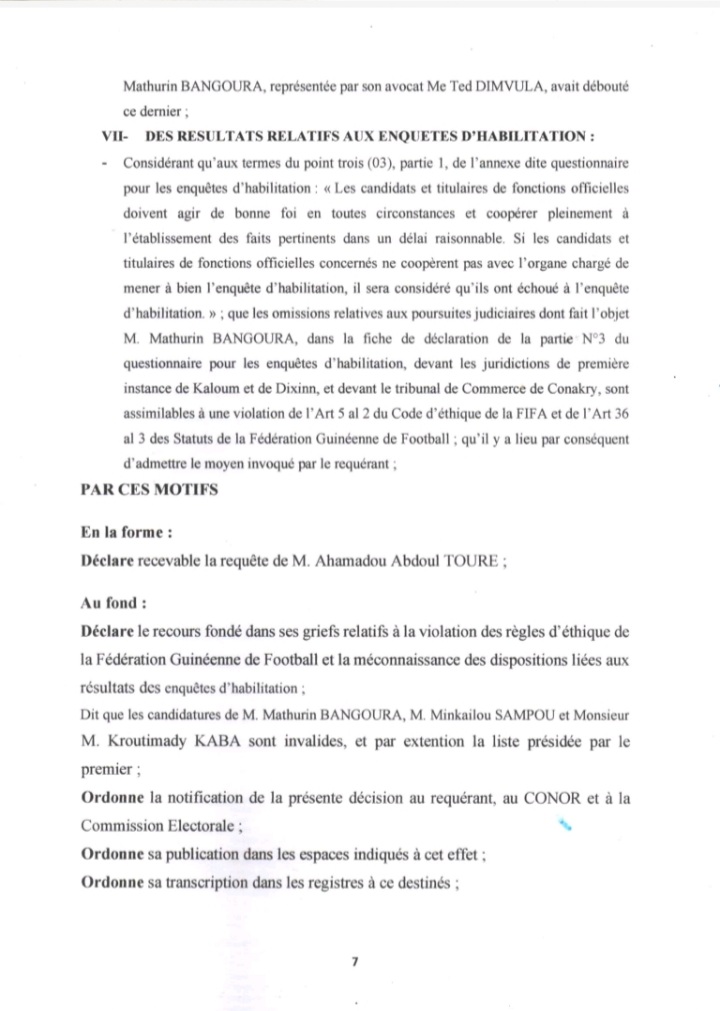 La commission électorale de recours de la fédération guinéenne de football explique l’invalidation de la candidature du Général Mathurin Bangoura par les ennuis judiciaires de l’homme qui serait même sous contrôle judiciaire.