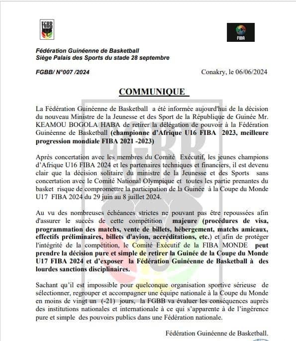 Coupe du Monde U17 FIBA 2024: Vers le retrait de la Guinée de la compétition ( communiqué FGBB)