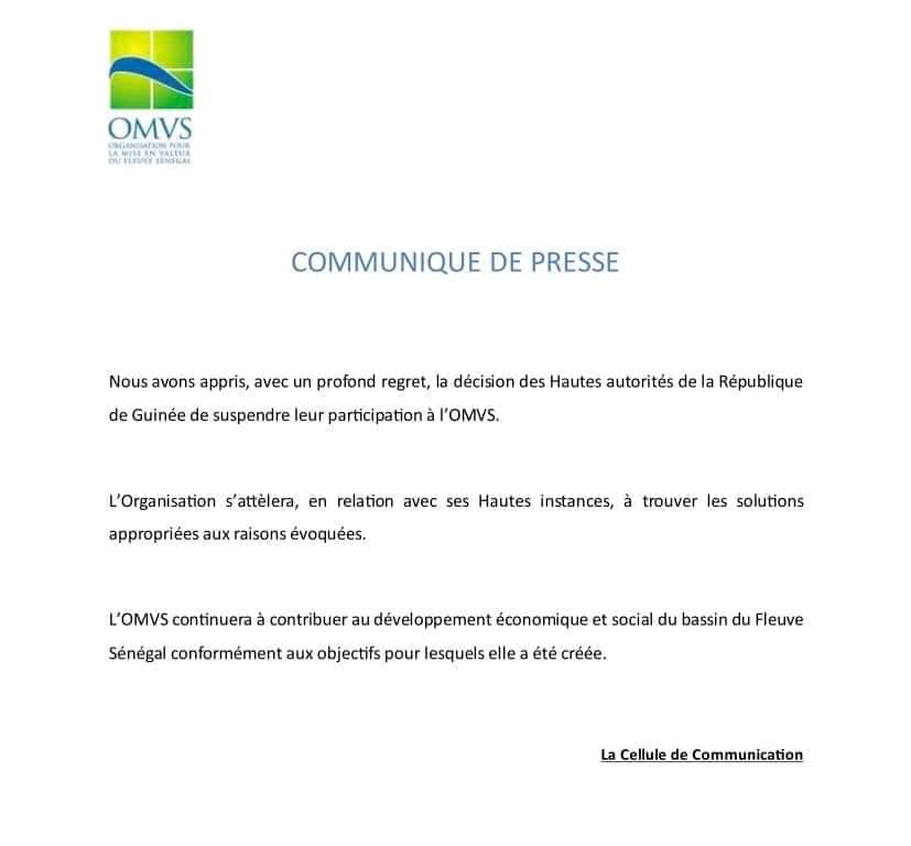 Dans un communiqué rendu public ce jeudi, 20 juillet 2023, l’OMVS dit avoir appris avec un profond regret, la décision des Hautes autorités de la République de Guinée de suspendre leur participation à l’Organisation pour la Mise en Valeur du fleuve Sénégal.