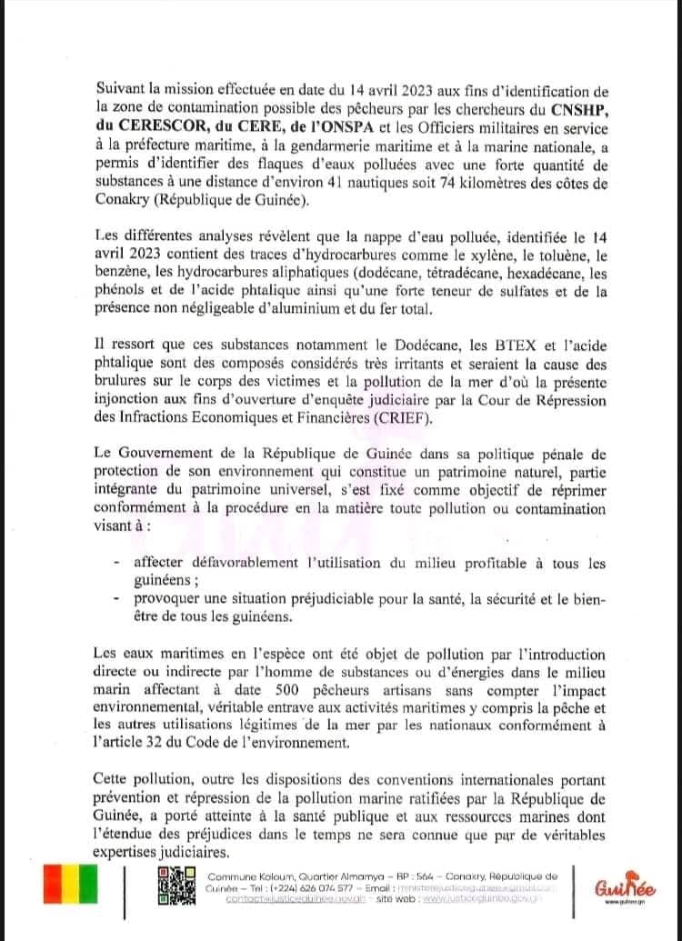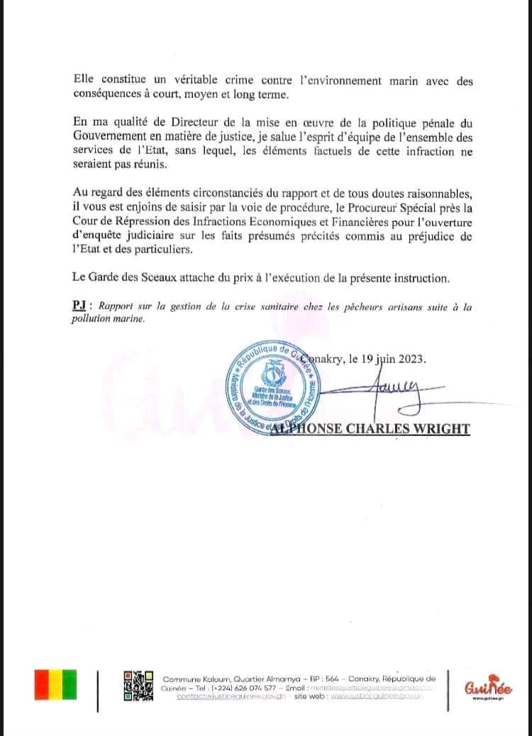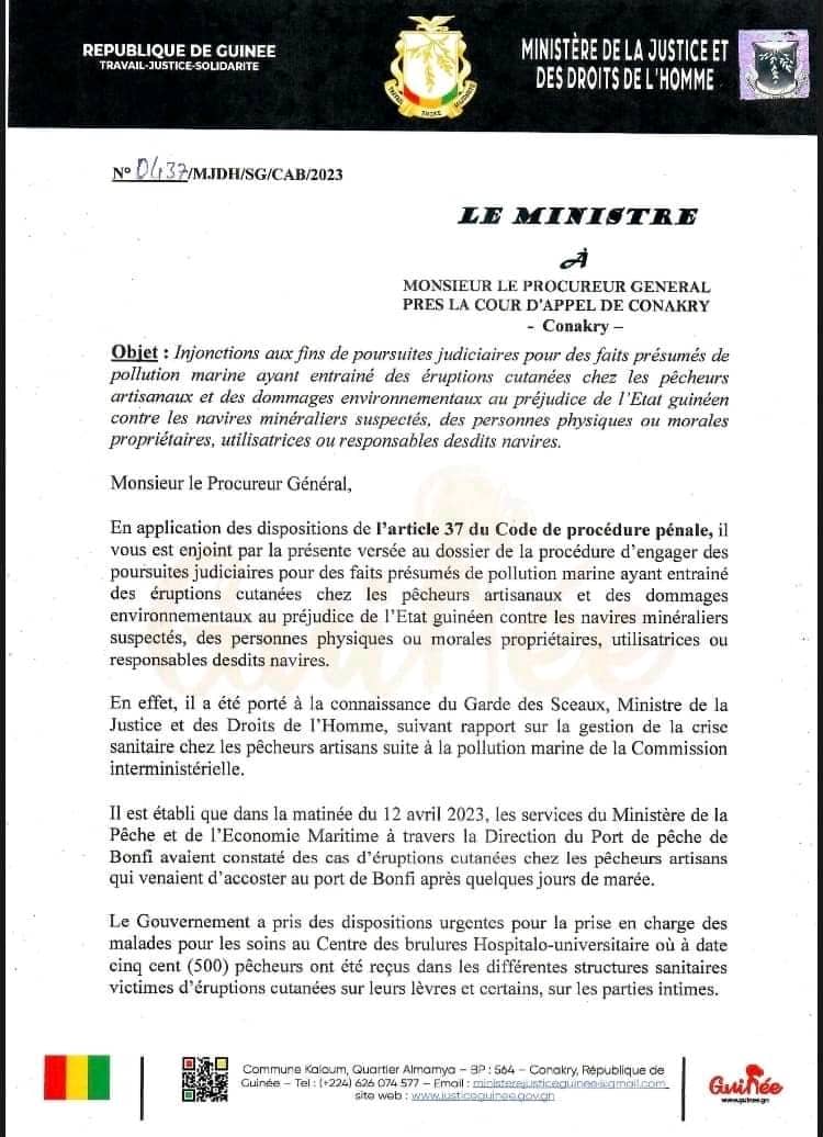 Dans une lettre d’injonction en date de ce 19 juin 2023, le ministre de la Justice et des droits de l’homme, Alphonse Charles Wright a ordonné au procureur général près la Cour d’appel de Conakry d’engager des poursuites judiciaires pour des faits présumés de pollution maritime ayant entrainé des éruptions cutanées chez les pêcheurs artisanaux et des dommages environnementaux au préjudice de l’État guinéen contre les navires minéraliers suspectés, des personnes physiques ou morales propriétaires, utilisatrices ou responsables desdits navires.