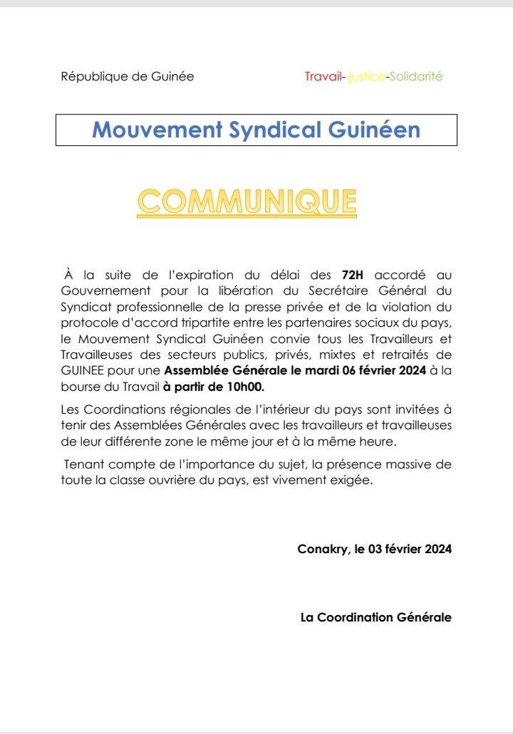 Face à la détention prolongée de Sékou Jamal Pendessa,  secrétaire général du Syndicat des Professionnels de la Presse de Guinée (SPPG), le Mouvement Syndical Guinéen (MSG) n’attend pas lâcher prise. Après avoir donné un ultimatum de 72h pour libérer Sékou Jamal Pendessa, le MSG n’a pas obtenu gain de cause. En effet, dans un communiqué parvenu au desk de Siaminfos.com ce samedi, 3 février 2024, le collectif a convié ses structures à une assemblée générale le 6 février prochain, à la bourse du travail et demande à ses coordinations régionales de l’intérieur du pays de tenir des assemblées générales avec les travailleurs en travailleuses de leur différente zone, le même jour et à la même heure.