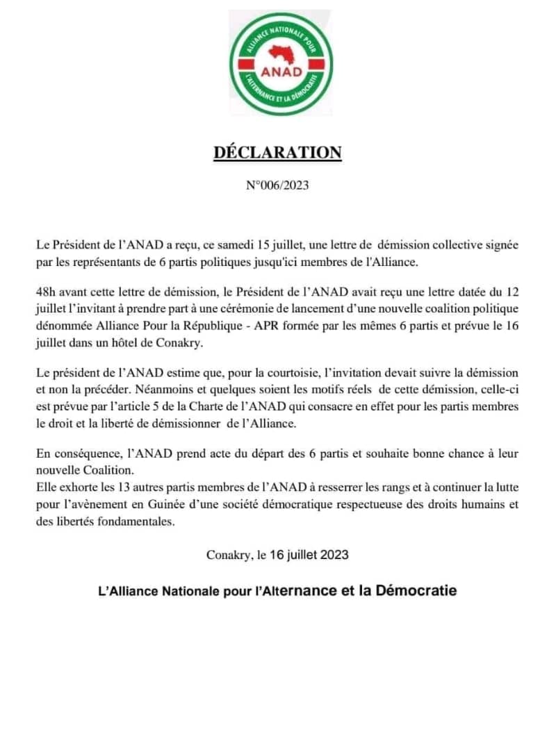 Après avoir souhaité bon vent à la nouvelle coalition, l’ANAD a invité les autres membres à resserrer les rangs pour « continuer la lutte pour l’avènement en Guinée d’une société démocratique ».