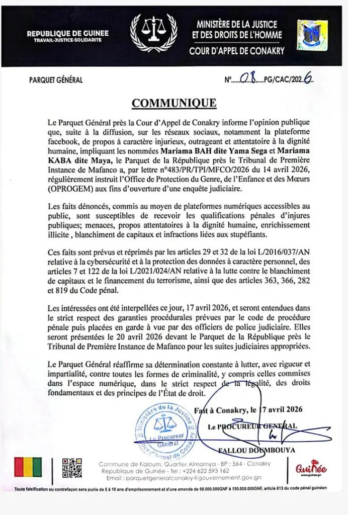 Vraisemblablement, l’étau se resserre autour de l’artiste Mariama Bah dite Yama Sega et l’influenceuse Mariama Kaba dite Maya. Alors que ces dernières se sont livrées à une bataille sans merci sur les réseaux sociaux ces derniers temps, la justice prend le devant. En effet, dans un communiqué rendu public dans la nuit du vendredi, 17 avril 2026, le Parquet général près la Cour d’Appel de Conakry annonce l’interpellation des mises en cause. Elles devront faire face donc à plusieurs chefs d’accusation notamment « injures publiques, menaces et blanchiment de capitaux ». D’ores et déjà, elles sont attendues au tribunal de première instance de Mafanco le 20 avril 2026.
