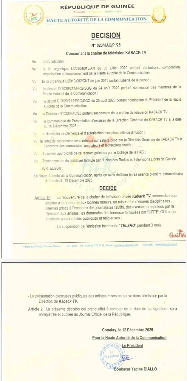 Il a fallu quarante huit heures pour que la Haute Autorité de la Communication (HAC) revienne sur sa décision. Suspendue pour 3 mois suite à l’affichage à l’antenne des propos « indécents, injurieux et diffamatoires », la chaîne Kaback TV peut continuer à émettre. La HAC motive sa décision par des « mesures disciplinaires internes prises à l’encontre des journalistes fautifs, des excuses présentées par la Direction aux artistes, les demandes de clémence formulées par l’URTELGUI et par plusieurs personnalités publiques et religieuses ».
