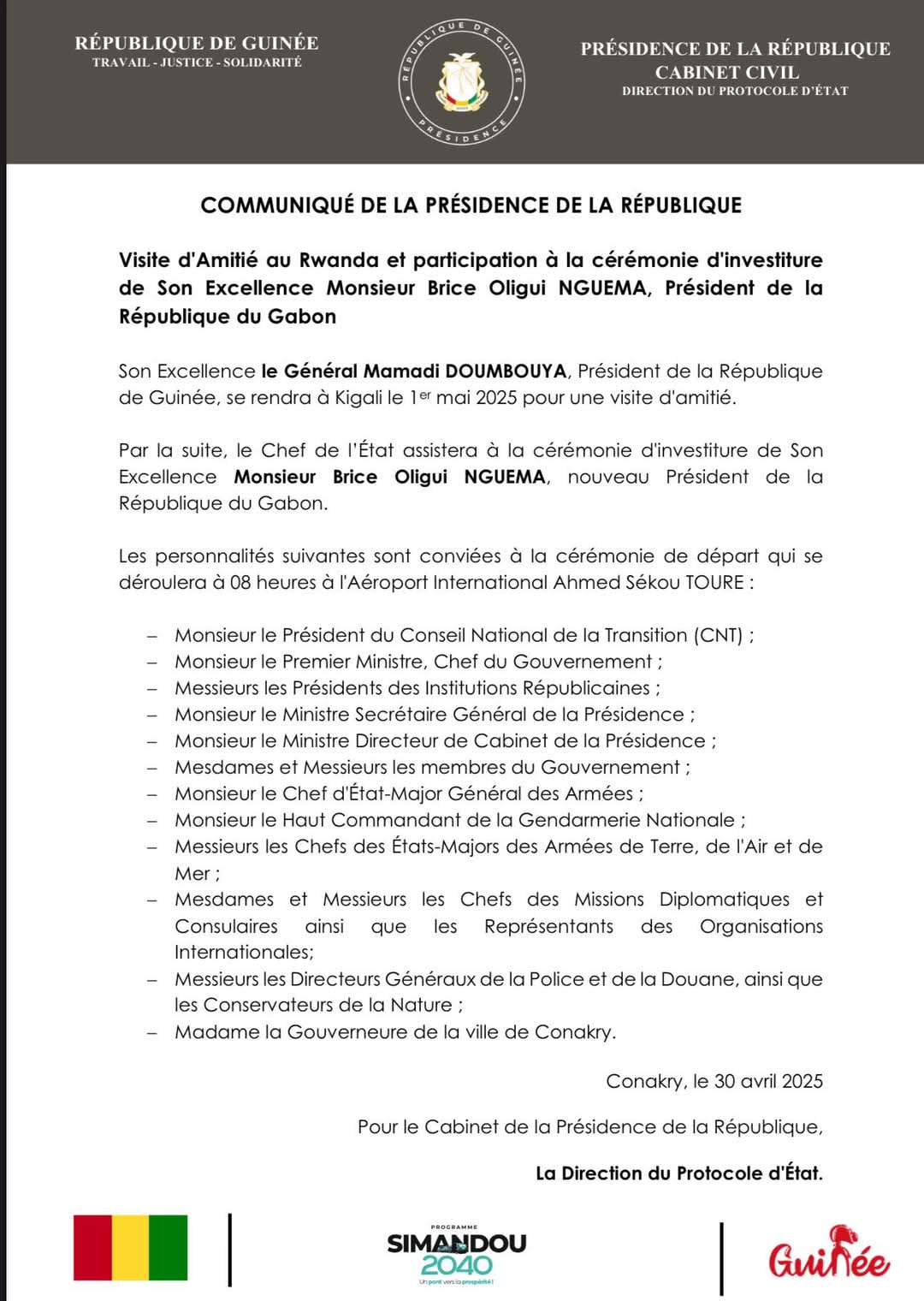 Dans un communiqué dont Siaminfos.com détient copie, la Présidence guinéenne annonce le départ du président de la République pour l’étranger. Ce jeudi, 1er mai 2025, le Général Mamadi Doumbouya va quitter Conakry pour Kigali dans le cadre d’une visite d’amitié, précise le communiqué. Ensuite, le locataire du palais Mohamed V prendra part à la cérémonie d’investiture de Brice Oligui NGUEMA à Libreville, au Gabon. Ci-dessous, ledit communiqué !