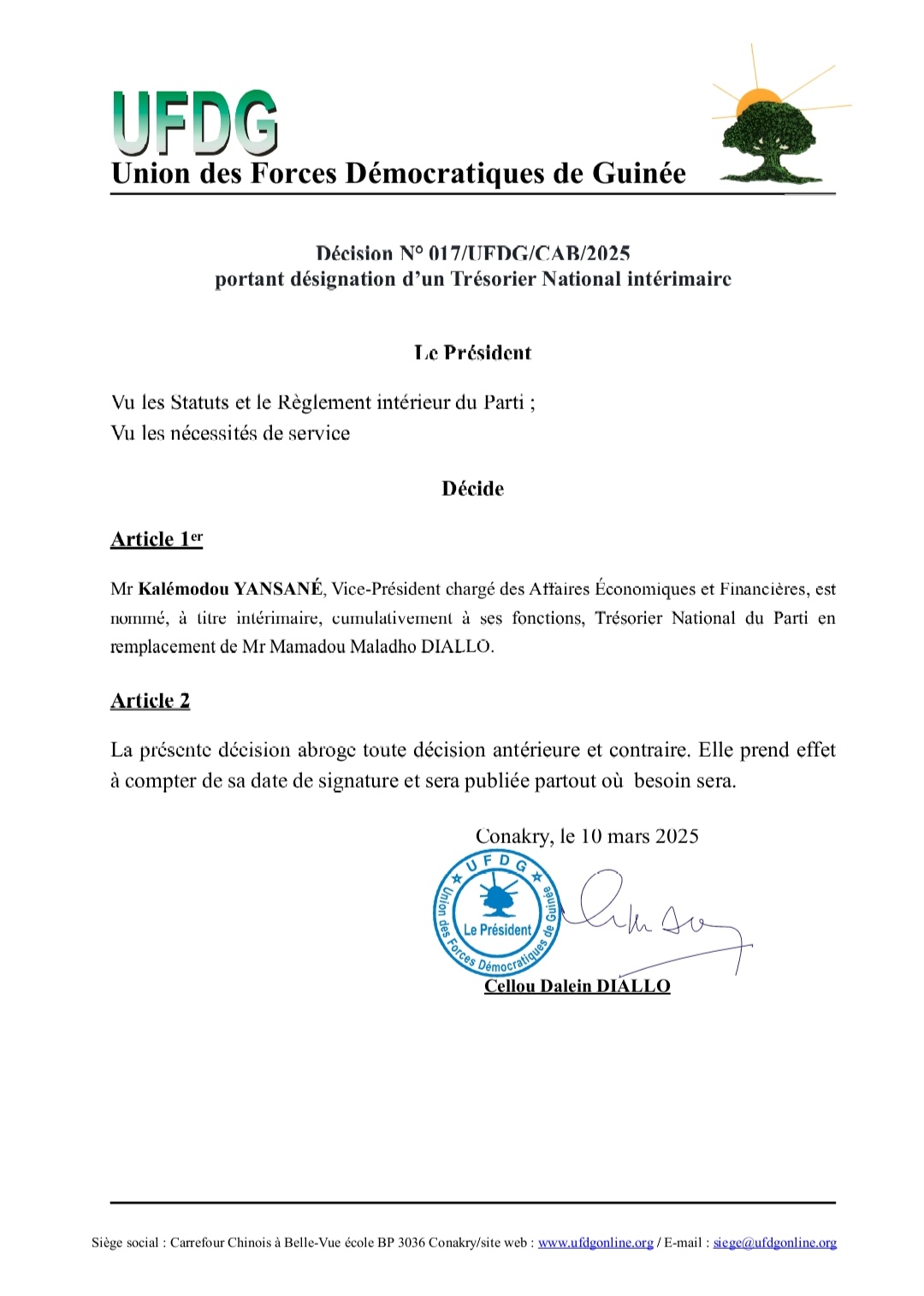 Dans les deux décisions parvenues au Desk de Siaminfos.com ce lundi,10 mars 2025, l’UFDG n’a pas donné les raisons de ces remplacements.