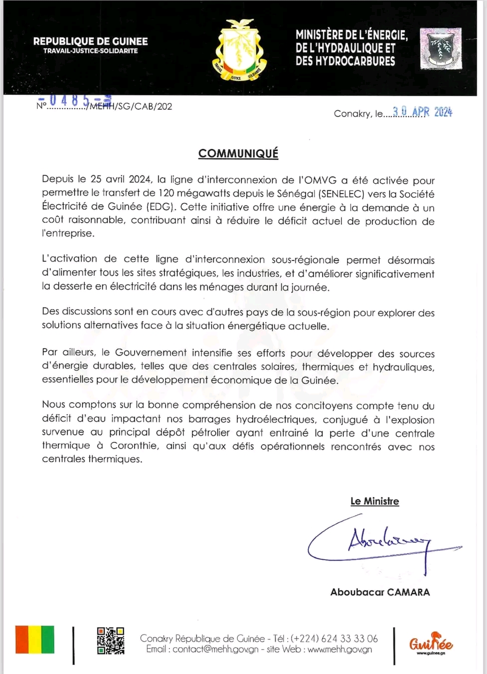 Dans un communiqué rendu public ce mardi, le ministre de l’énergie, de l’hydraulique et des hydrocarbures a informé l’opinion que depuis le 25 avril 2024, la ligne d’interconnexion de l’OMVG a été activée pour permettre le transfert de 120 mégawatts depuis le Sénégal (SENELEC) vers la Société Électricité de Guinée (EDG).