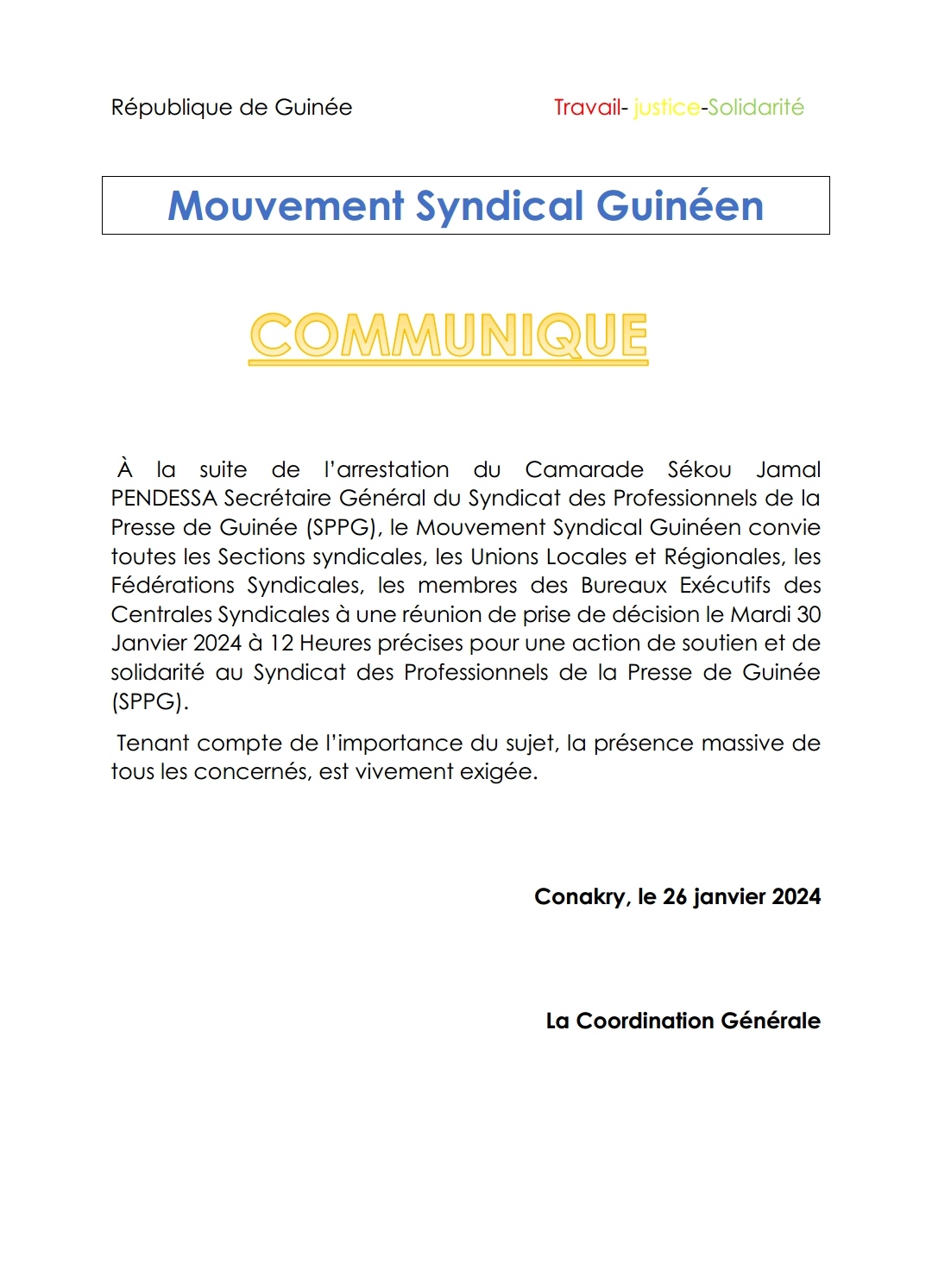 Face à la détention de Sékou Jamal Pendessa à la maison centrale de Conakry, le Mouvement Syndical guinéen (MSG) n’attend pas lâcher prise. Dans un communiqué parvenu au desk de Siaminfos.com ce vendredi, 26 janvier 2024, le mouvement a appelé à une grande réunion. Ladite réunion se tiendra le 30 janvier prochain, entre plusieurs structures syndicales. A l’issue de cette réunion, des décisions seront prises sans nul doute.