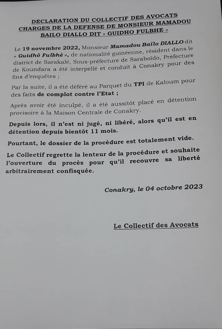 Dans une déclaration parvenue au desk de Siaminfos.com dans la soirée de ce mercredi, 4 octobre 2023, le collectif des avocats de Mamadou Baïlo Diallo alias Guidhö Fulbhè, s’est fait entendre. En effet, ils dénoncent la détention prolongée de ce dernier et exigent la tenue d’un procès.