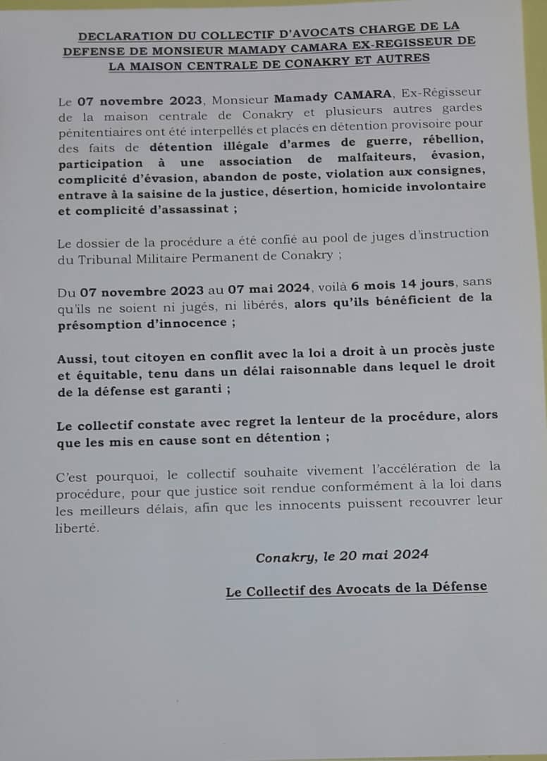 A travers une déclaration rendue publique ce 20 mai 2024, le collectif dit constater avec regret la lenteur de la procédure, alors que les mis en cause sont en détention.