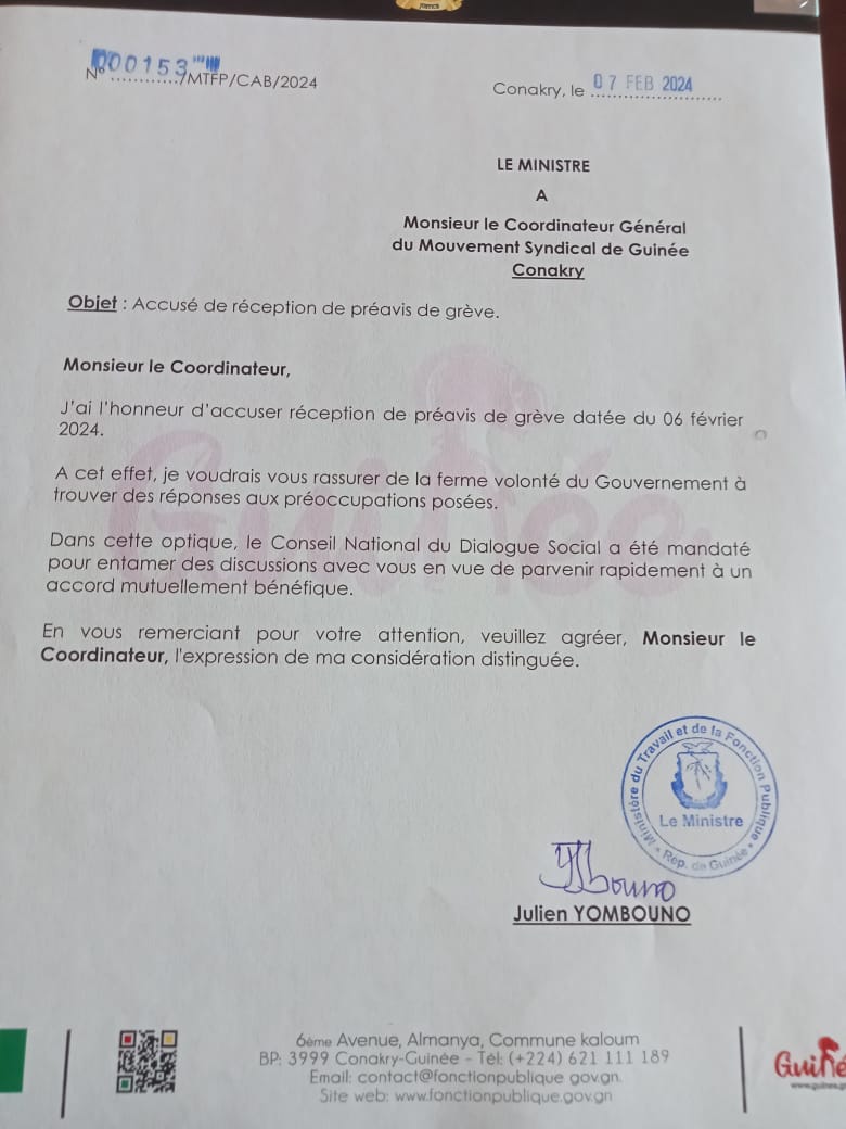 A travers un courrier en date du 07 février 2024, le ministre du Travail et de la Fonction Publique dit avoir accusé réception du préavis de grève du mouvement syndical guinéen. Le ministre Julien Yombouno a rassuré de la ferme volonté du gouvernement à trouver des réponses aux préoccupations posées.