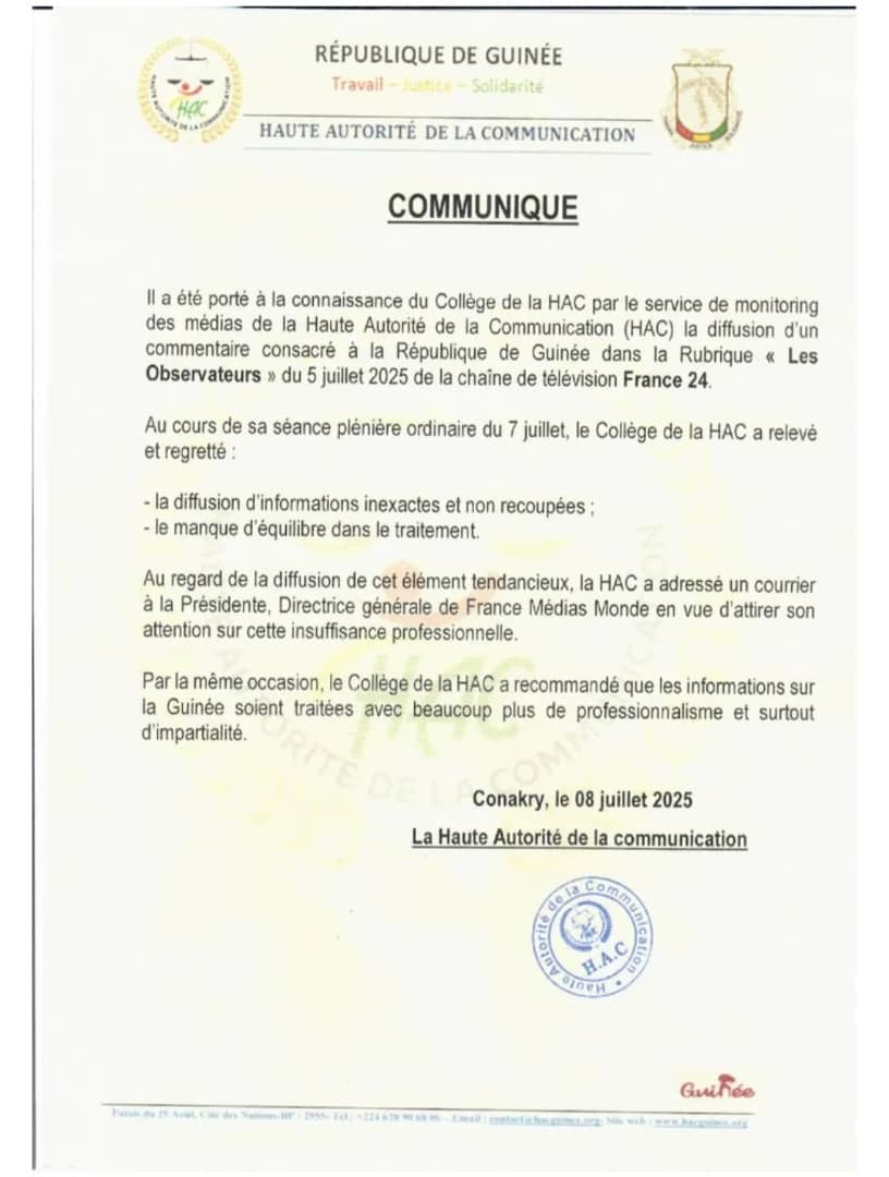 Dans un communiqué parvenu au desk de Siaminfos.com ce mardi, 8 juillet 2025, la Haute Autorité de la Communication (HAC) a adressé un courrier à la PDG de France Médias Monde. En effet, l’institution de régulation des médias en Guinée reproche à la chaîne de télévision France 24 la diffusion d’informations « inexactes » et « non recoupées » sur la Guinée, mais également le « manque d’équilibre » dans le traitement. Regrettant cette « insuffisance professionnelle », la HAC recommande que les informations sur la Guinée soient traitées avec « beaucoup plus de professionnalisme et surtout d’impartialité ».