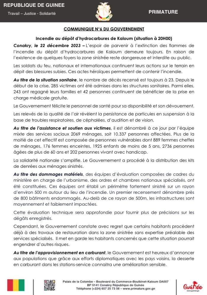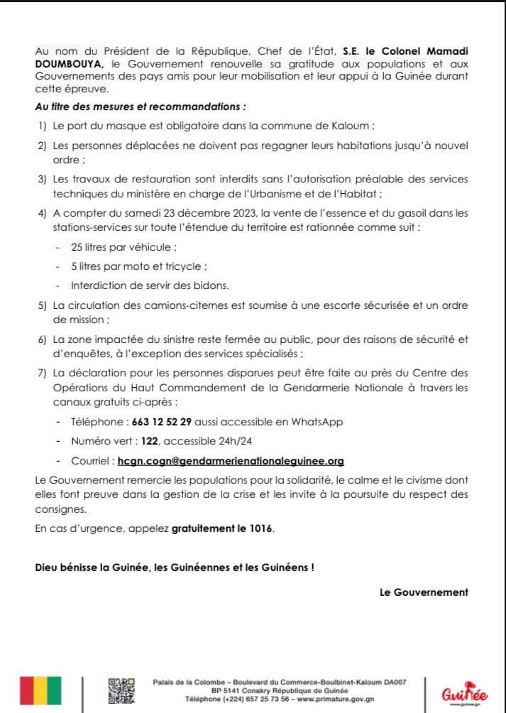 Plus le temps passe, plus le gouvernement guinéen lève certaines restrictions, suite au drame pétrolier survenu au dépôt d’hydrocarbures de Kaloum, il y a quelques jours. En effet, si l’approvisionnement en gasoil a été autorisé avant-hier nuit, ce sera le cas pour l’essence dès ce samedi, 23 décembre 2023 dans les stations-service. C’est le porte-parole du gouvernement qui a fait l’annonce tard dans la nuit de ce vendredi, 22 décembre courant. Dans ledit communiqué, il est mentionné clairement qu’aucun véhicule ne doit prendre plus de 25 litres, tandis que c’est 5 litres par moto et tricycle, et le gouvernement interdit aux stations-service de servir des bidons. Ci-dessous, plus de détails !