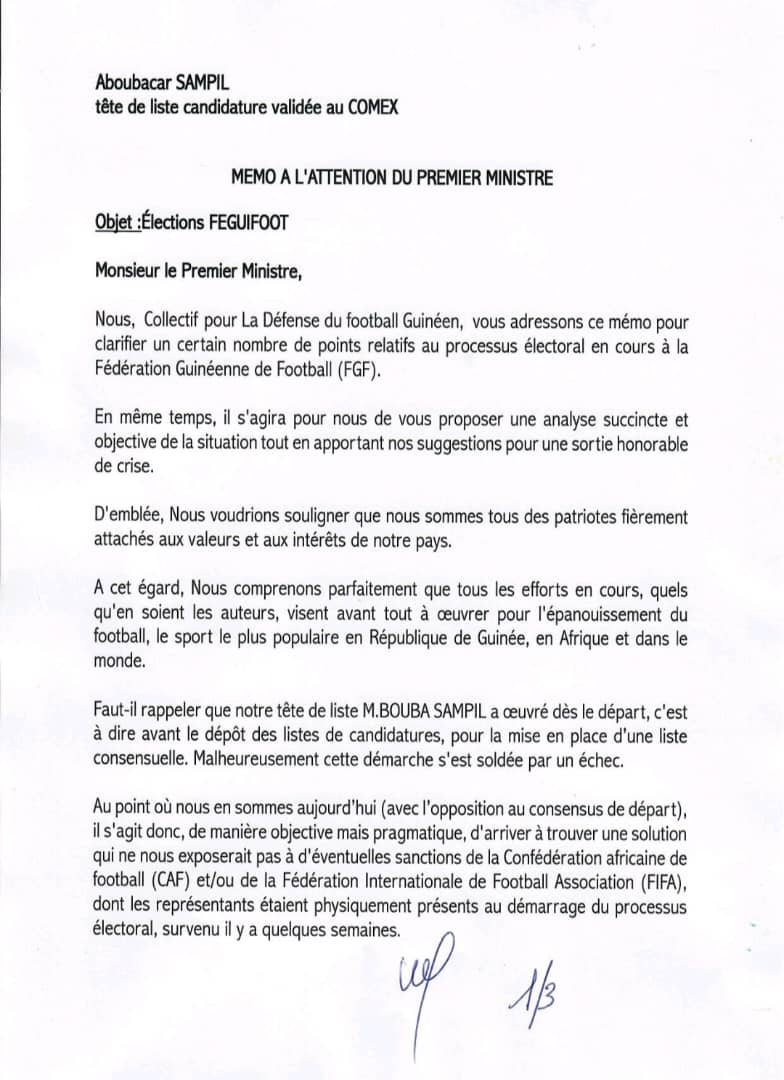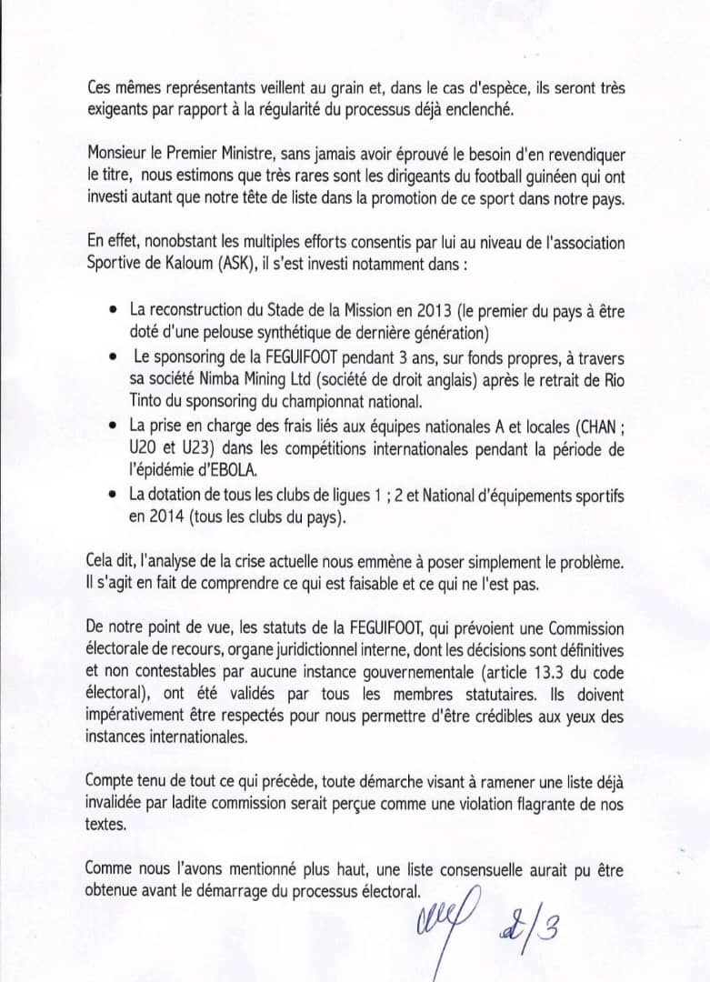 Dans ce courrier, le Président du AS Kaloum et son groupe se sont catégoriquement opposés à la réintégration de la liste de Mathurin Bangoura déjà éliminée, car pour eux, les statuts de la FEGUIFOOT, qui prévoient une Commission électorale de recours, organe juridictionnel interne, dont les décisions sont définitives et non contestables par aucune instance gouvernementale (article 13.3 du code électoral), ont été validés par tous les membres statutaires. Donc, disent-ils, ces textes doivent impérativement être respectés pour nous permettre d’être crédibles aux yeux des instances internationales.