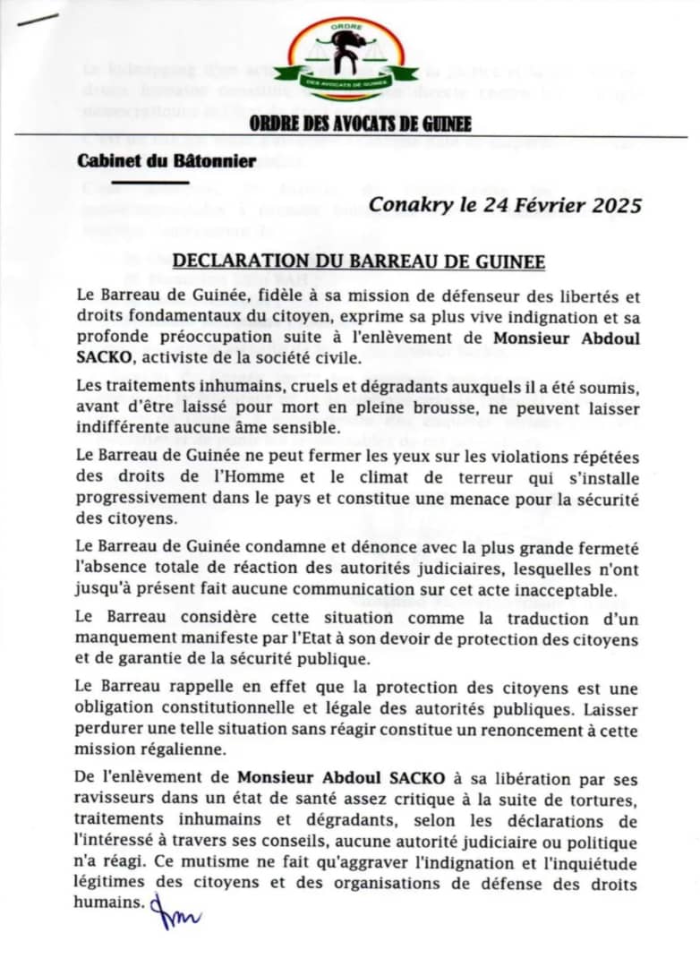 Ce lundi, 24 février 2025, le Barreau de Guinée s’est fendu d’une déclaration pour dénoncer le silence des autorités judiciaires du pays face à ce qu’il qualifie de menace directe contre les principes démocratiques et l’État de droit en Guinée.