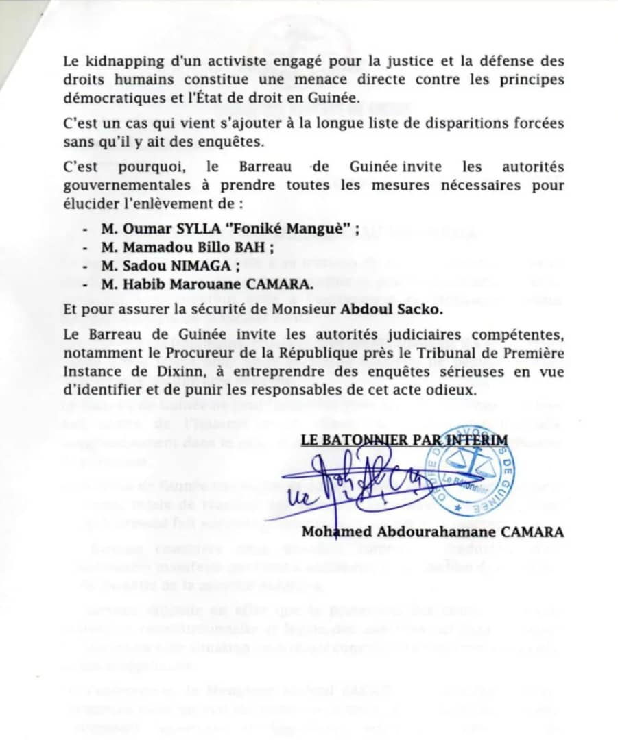 Dans sa déclaration, le Barreau s’est adressé directement au procureur de la République près le Tribunal de Première Instance de Dixinn d’ouvrir une enquête sérieuse dans cette affaire.