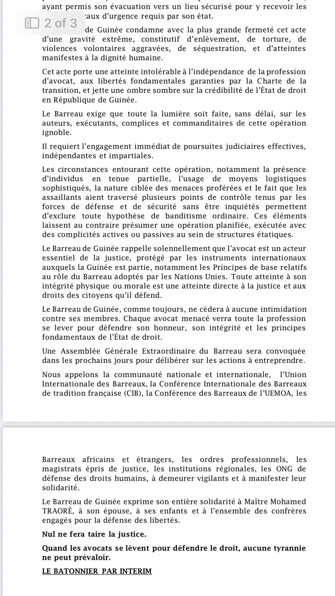 Rouge de colère, le Barreau de Guinée entend se retrouver dans les prochains jours pour statuer sur cette affaire et probablement annoncer des actions fortes. Cependant, il prévient que « chaque avocat menacé verra toute la profession se lever pour défendre son honneur, son intégrité et les principes fondamentaux de l’État de droit. »