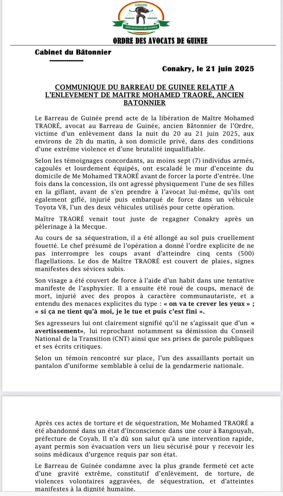 Enlevé aux environs de 2 heures du matin, l’ancien bâtonnier de l’ordre des avocats a été retrouvé dans un « état critique » à Coyah. Dans un communiqué rendu public ce samedi, 21 juin 2025, le Barreau de Guinée fait savoir que Me Mohamed Traoré a été enlevé à son domicile avant d’être emmené de force pour une destination inconnue. Selon la même organisation, l’ancien membre du Conseil national de la transition (CNT) a été par la suite roué de coups violents et « menacé de mort » par ses bourreaux.