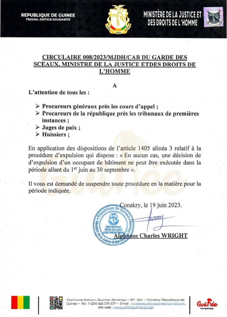 Expulsion des locataires de bâtiment en Guinée : cette importante note circulaire du ministre de la Justice
